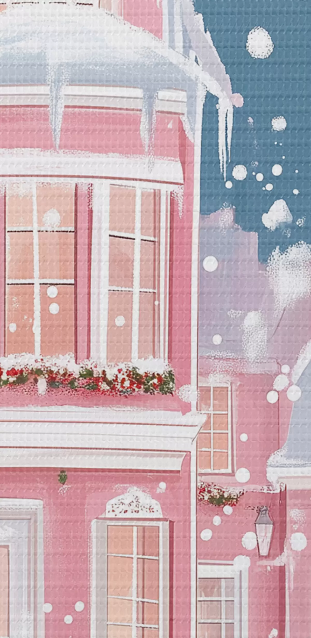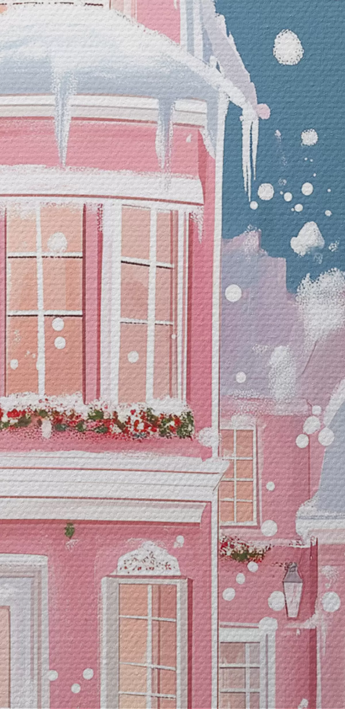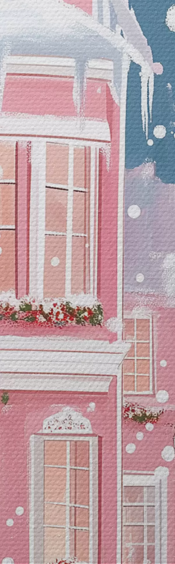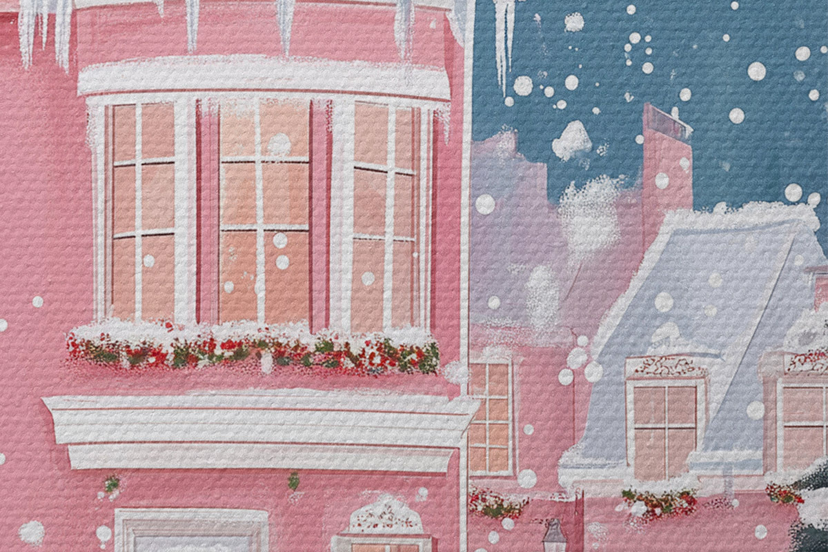 Immagine Città invernale con case rosa, alberi di Natale e fiocchi di neve Nr r42792