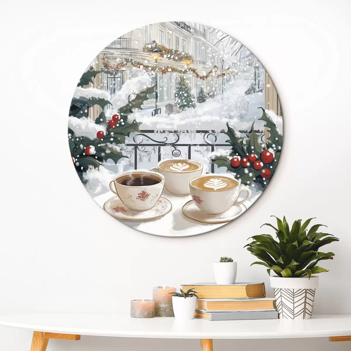 Quadri rotondi Estetica invernale, tazze di caffè, ristorante, strada cittadina r42794