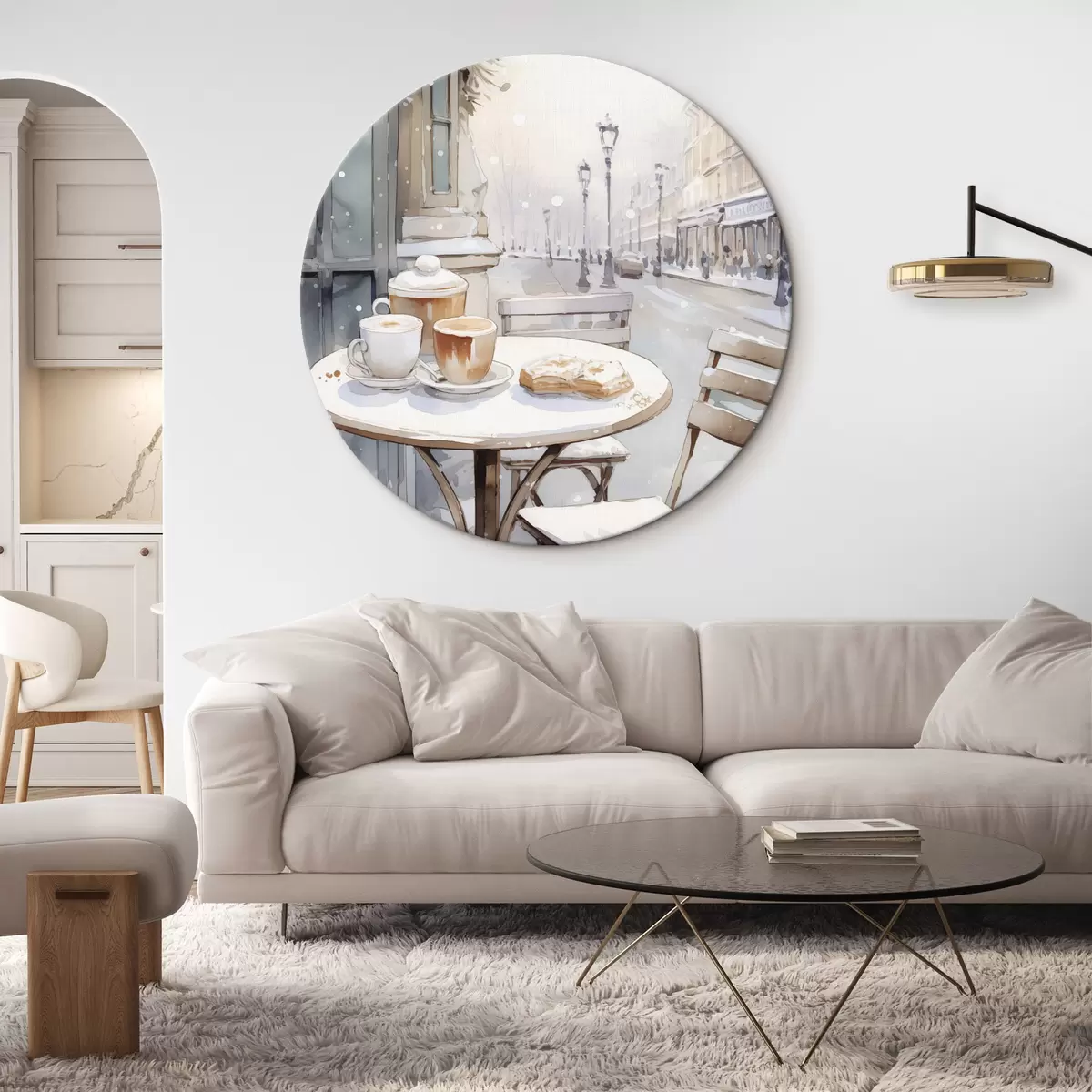 Quadri rotondi Caffè di strada estetico, Francia, panetteria fresca, disegno in stile acquerello r42798
