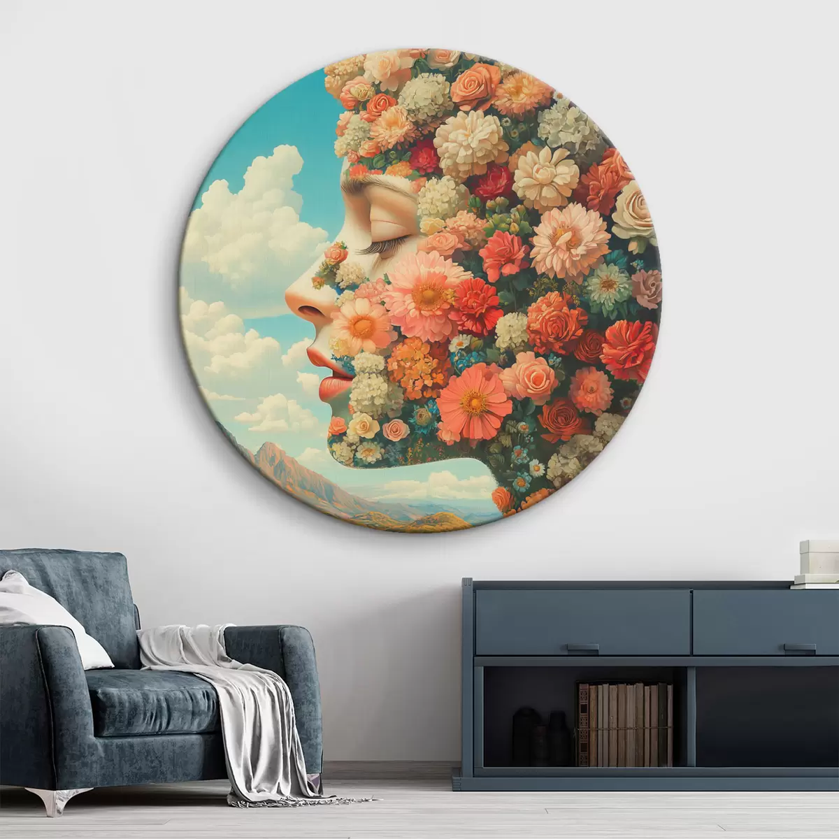 Quadri rotondi Volto di profilo tra i fiori r42861