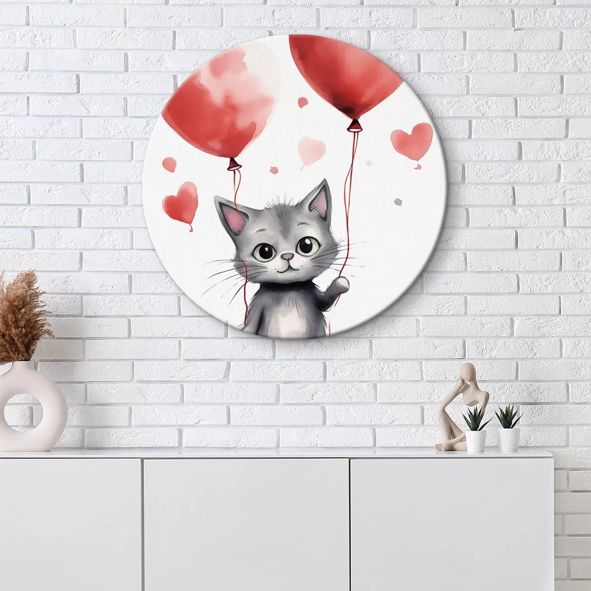 Quadri rotondi Simpatico gattino con palloncini a forma di cuore r42871