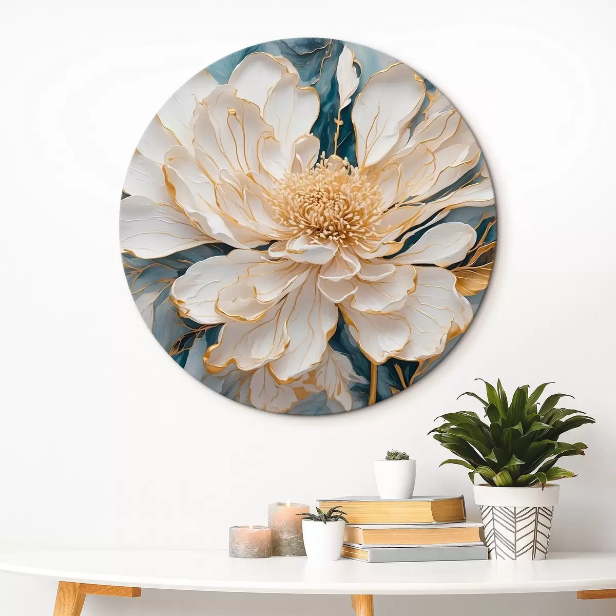 Quadri rotondi Fiore bianco con contorni su sfondo blu e bianco r42923