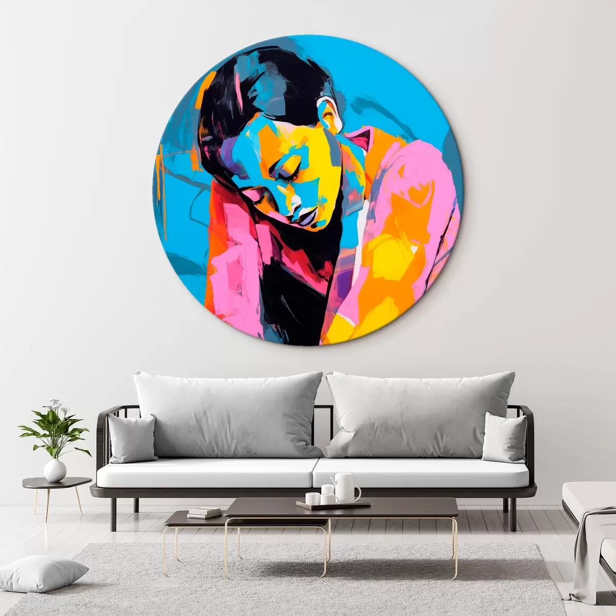 Quadri rotondi Ritratto astratto di una persona pensierosa in colori vivaci r42936