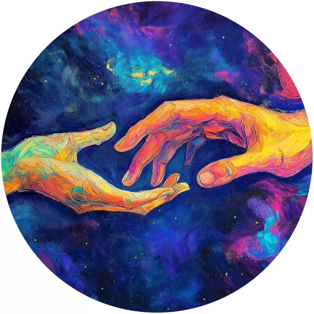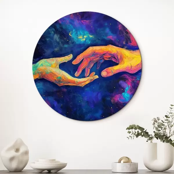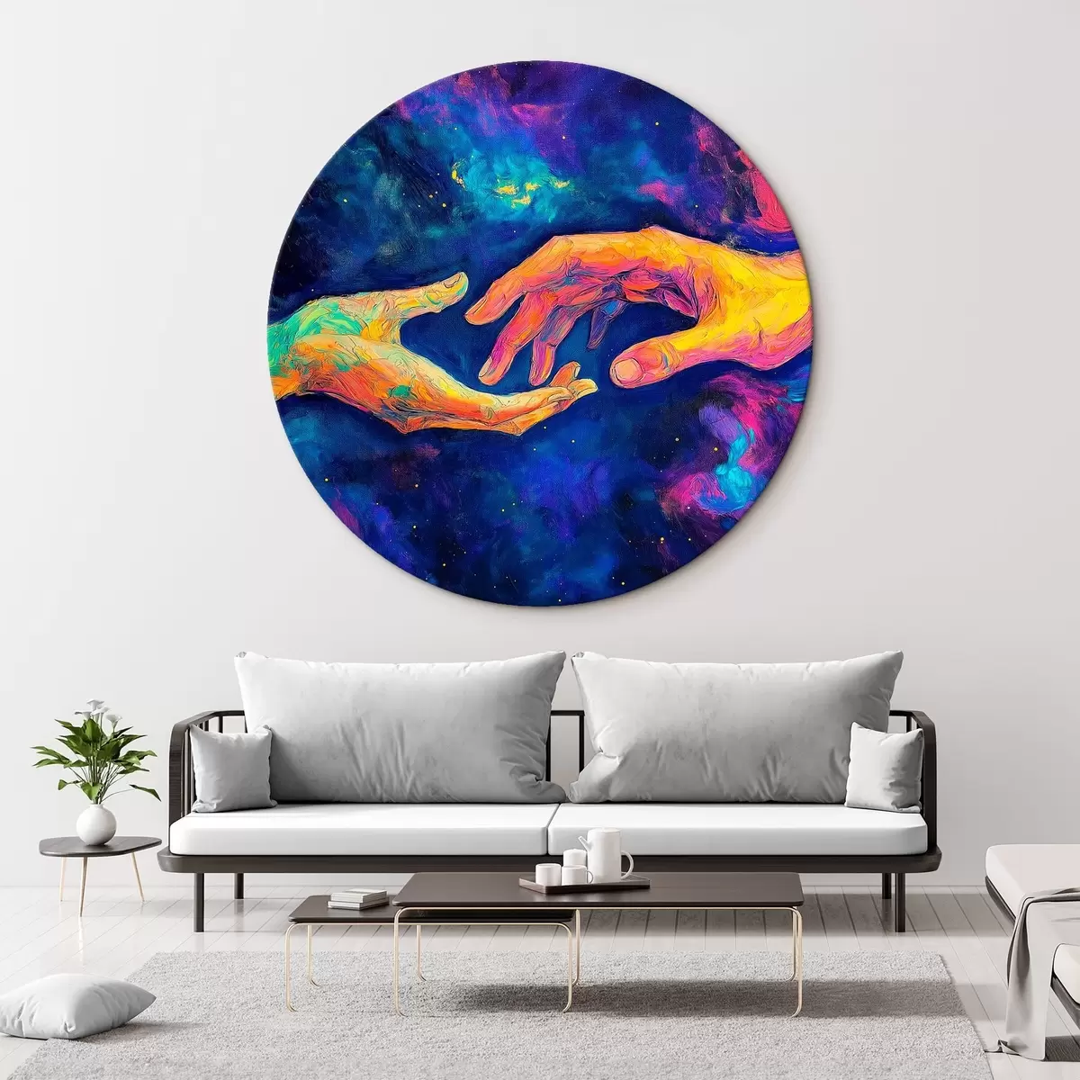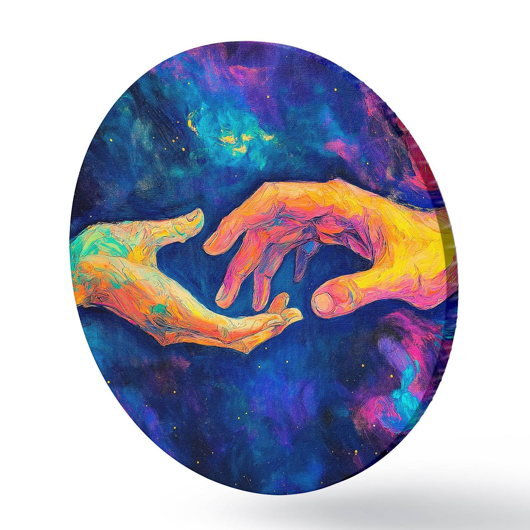 Quadri rotondi Composizione astratta di due mani che si tendono l'un l'altra, in una tavolozza di colori vivaci su uno sfondo cosmico r42937