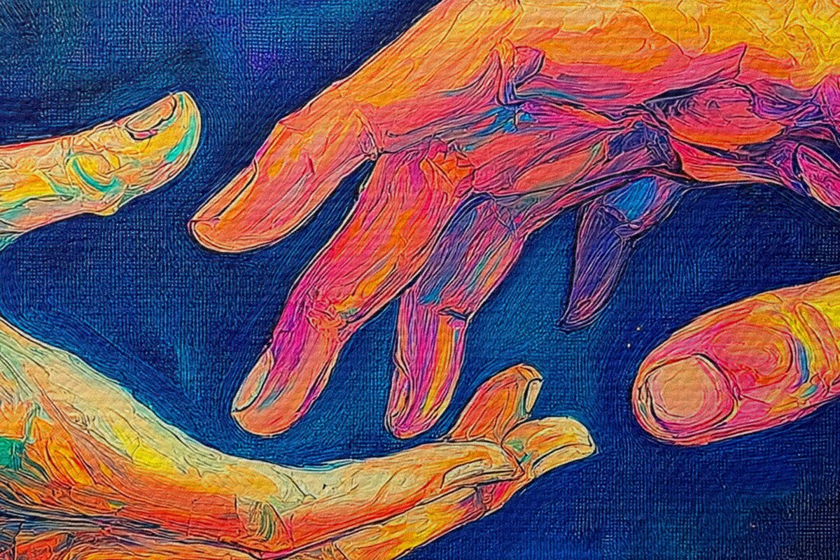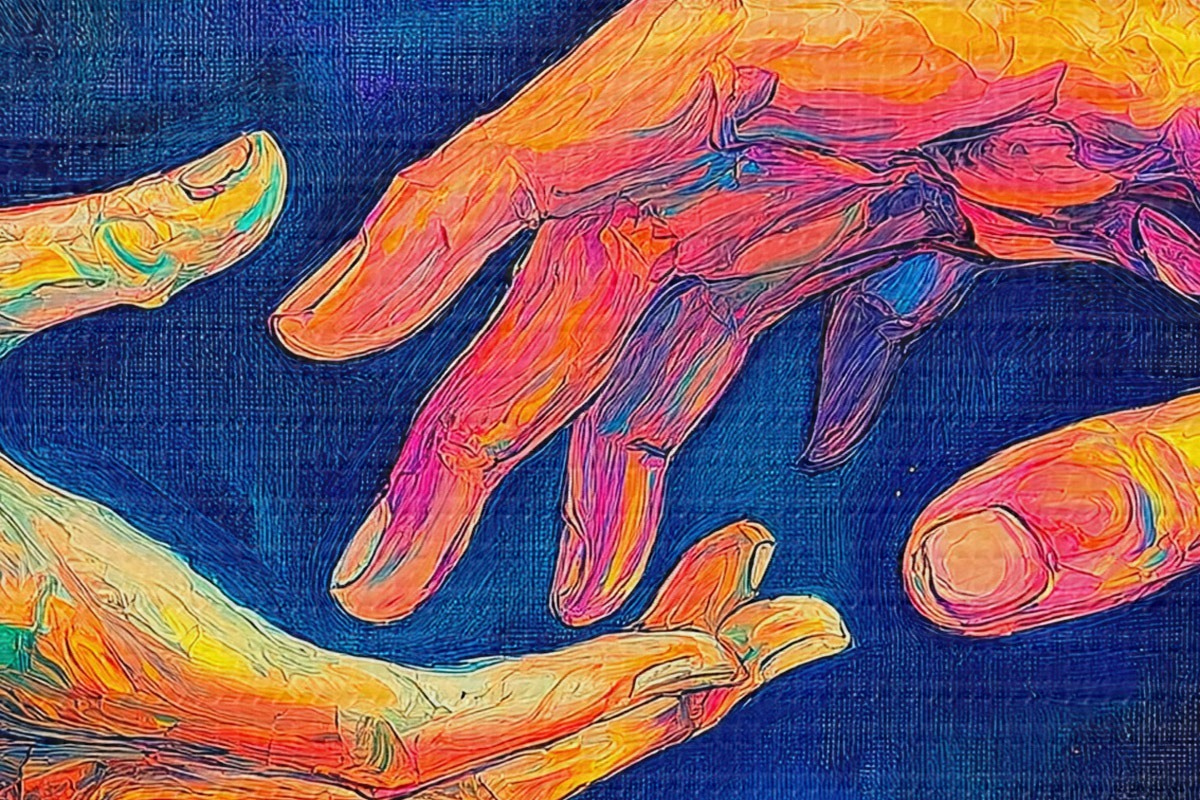 Immagine Composizione astratta di due mani che si tendono l'un l'altra, in una tavolozza di colori vivaci su uno sfondo cosmico Nr r42937