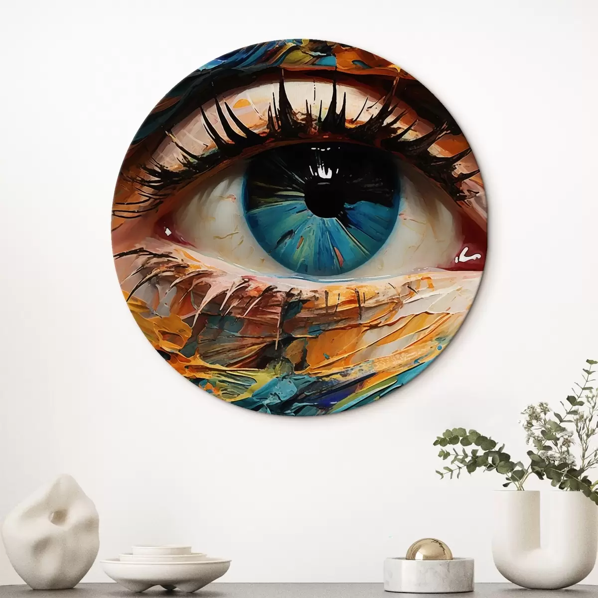 Quadri rotondi Ritratto astratto di un occhio in colori vivaci, con un effetto di pittura strutturata r42938