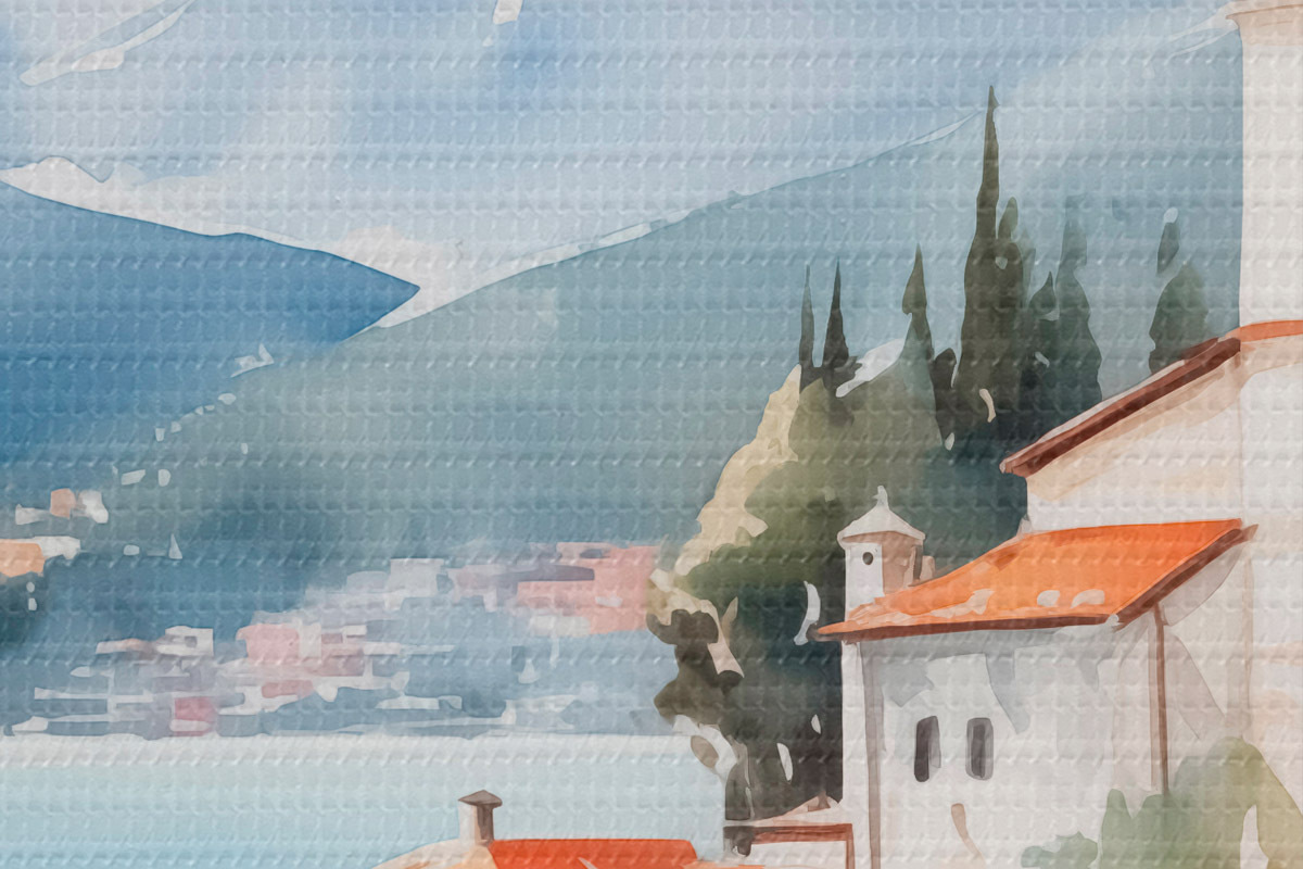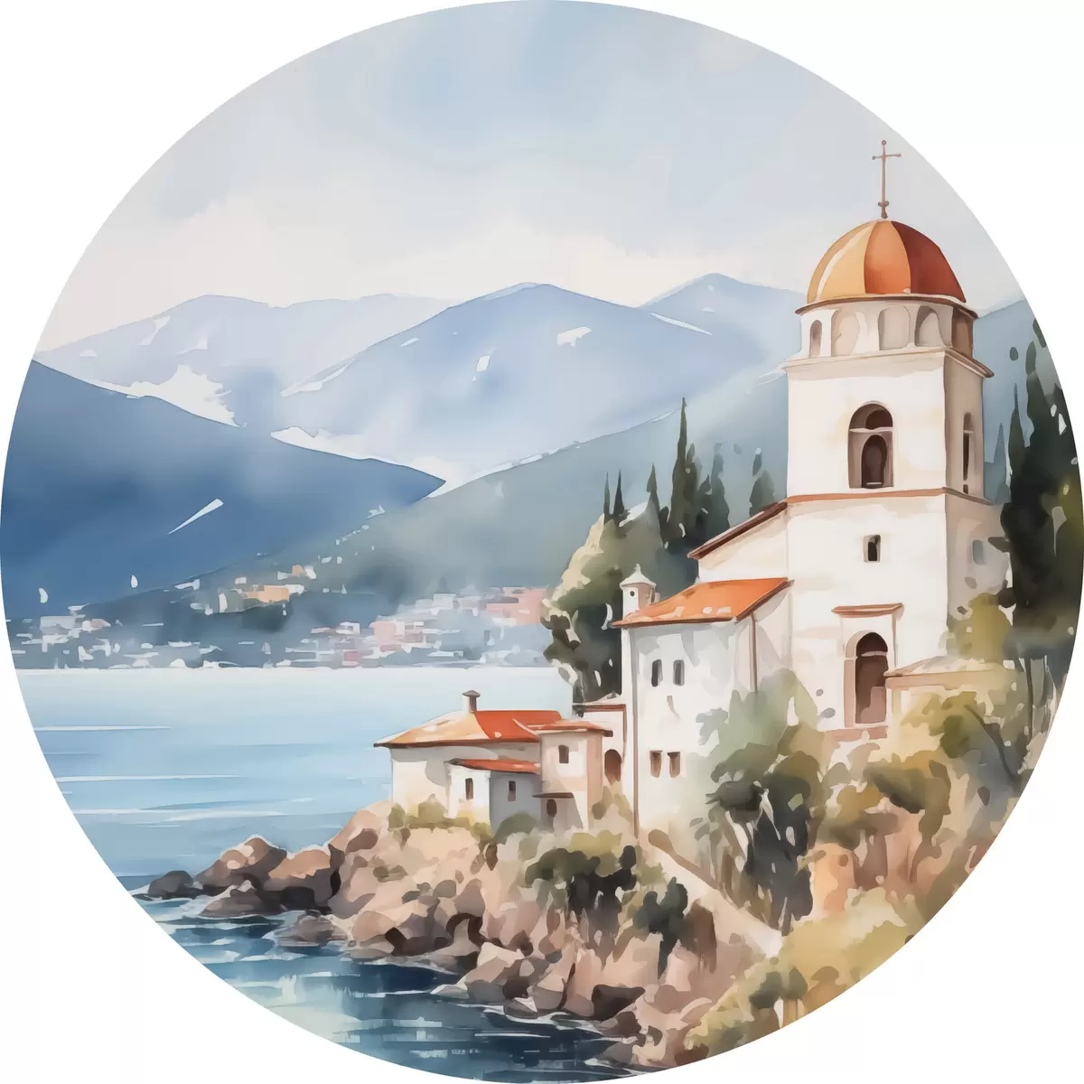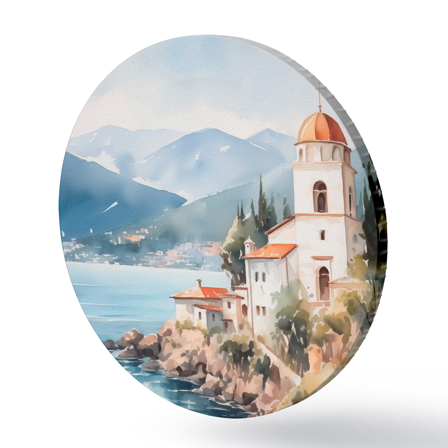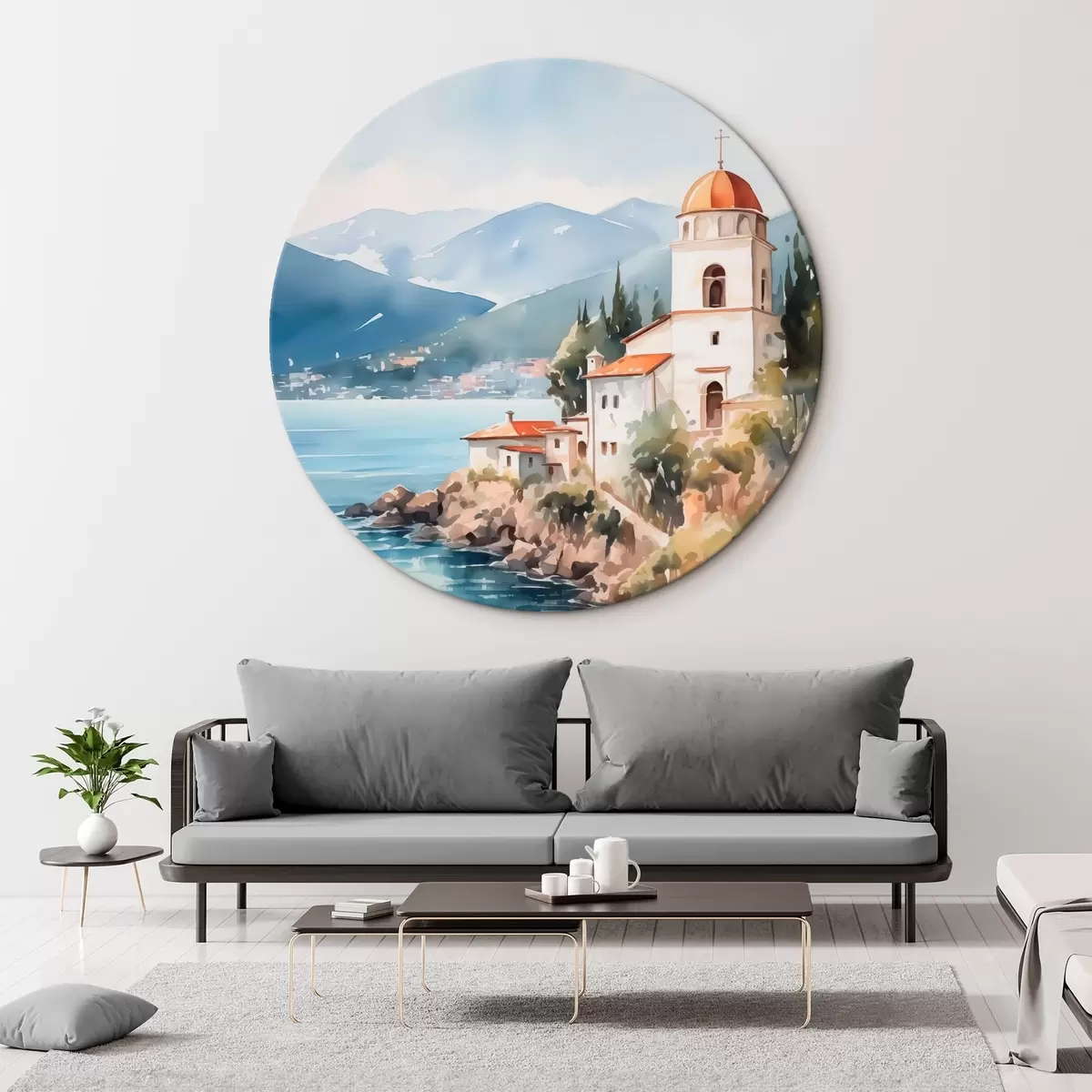Quadri rotondi Chiesa in riva al mare con montagne sullo sfondo r42962