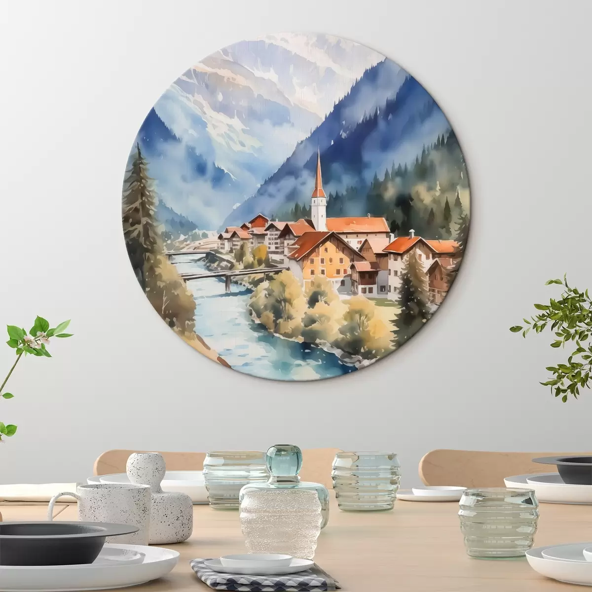 Quadri rotondi Villaggio vicino alle montagne imitazione acquerello r42964
