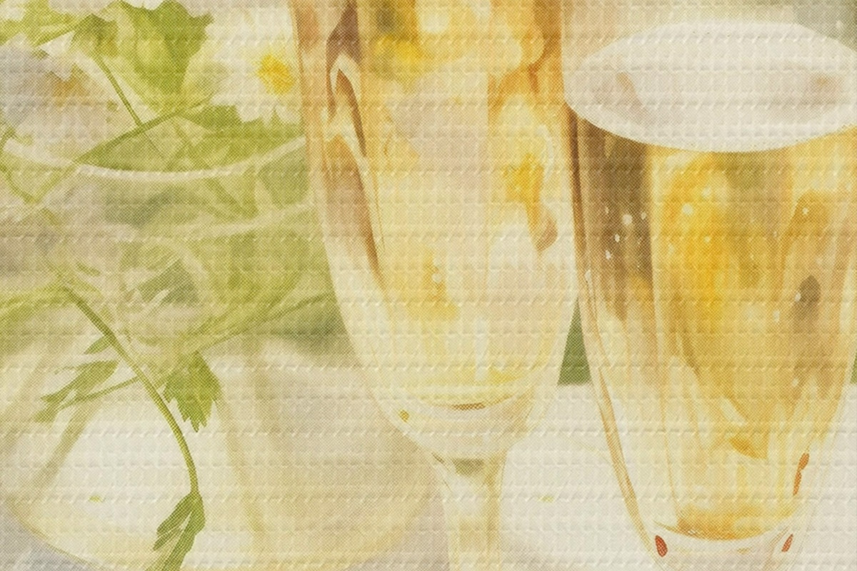 Immagine Bicchieri da champagne con fragole sul vassoio, fiori di camomilla, estate Nr r43054