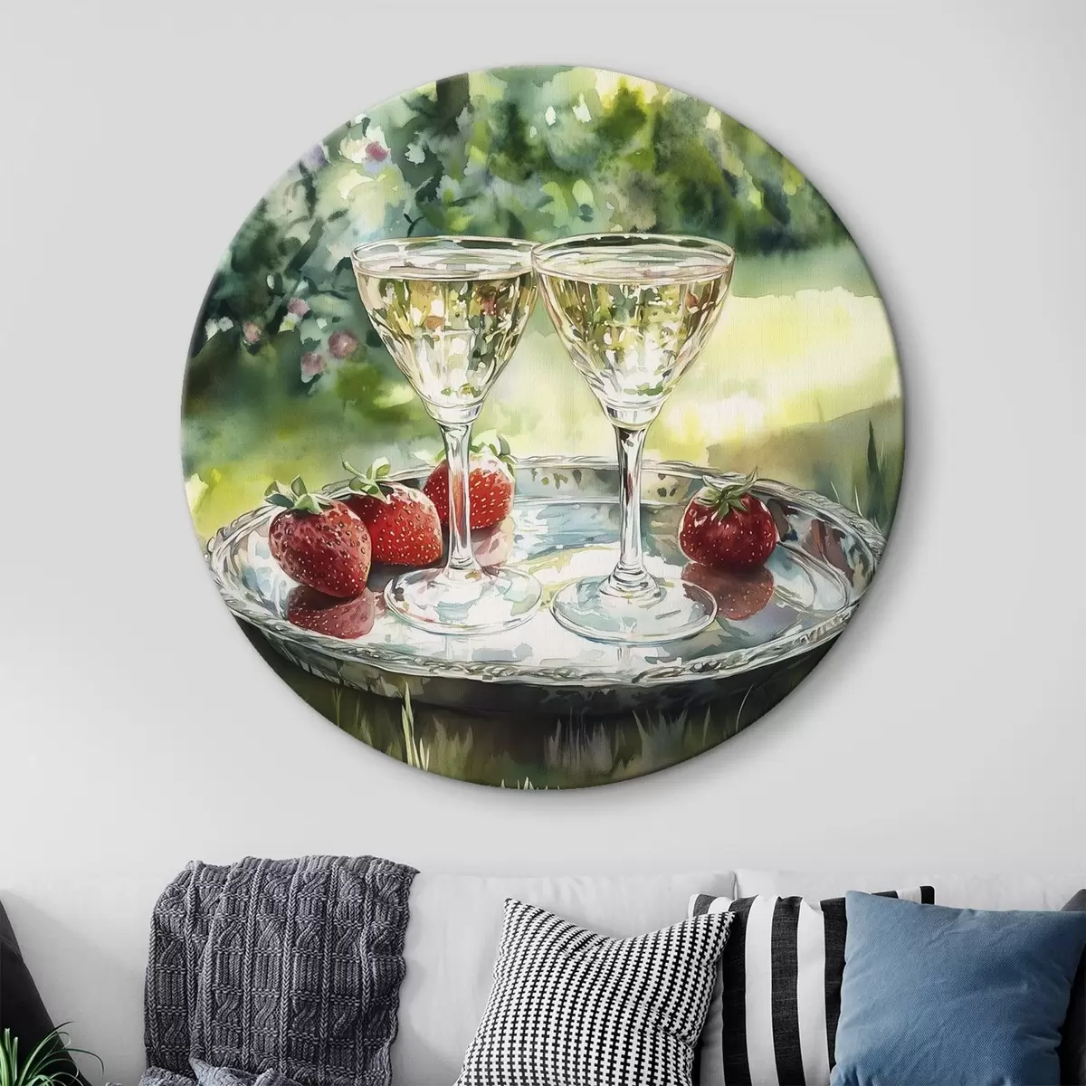 Quadri rotondi Picnic estivo con champagne e fragole, disegno in stile acquerello r43055