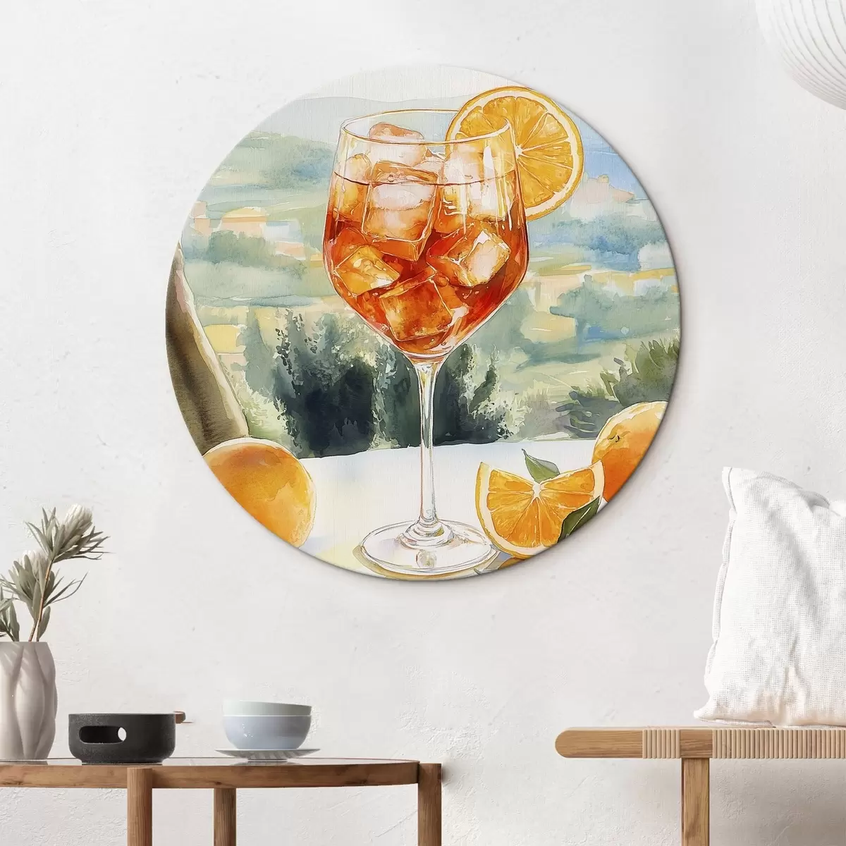 Quadri rotondi Cocktail estivo, Aperol Spritz, arance, disegno in stile acquerello r43058