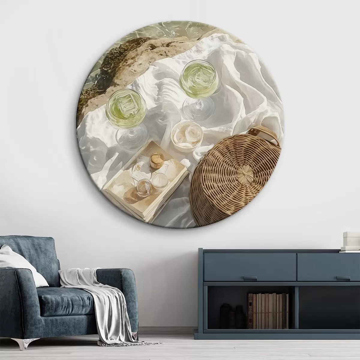 Quadri rotondi Estetica estiva, onde dell'oceano, spiaggia, cocktail, stile acquerello r43069