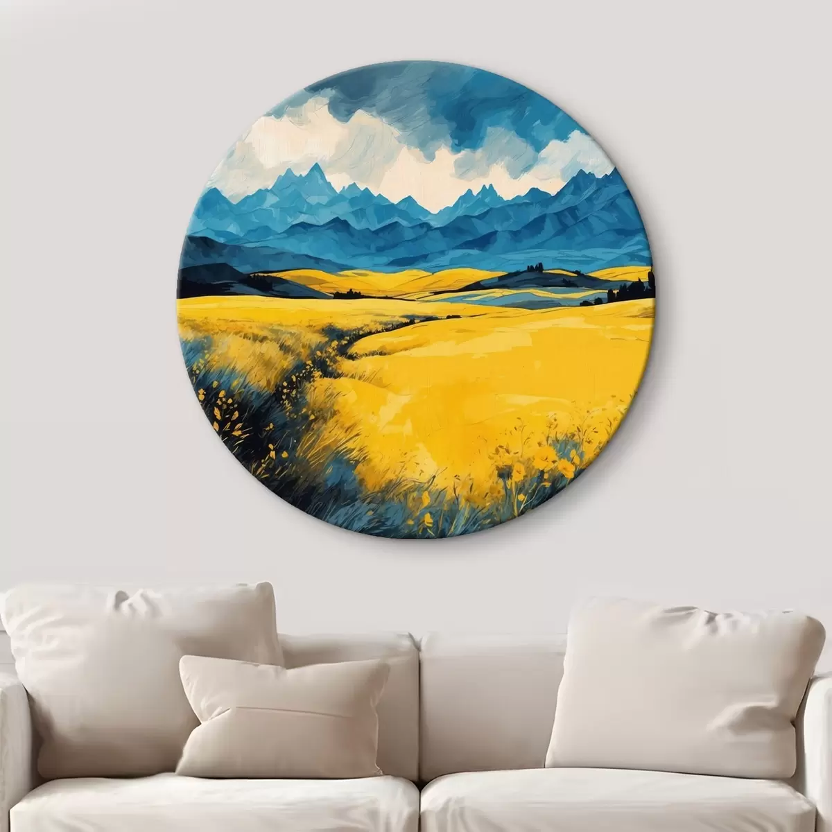 Quadri rotondi Campo giallo sullo sfondo delle montagne in stile pittura ad acquerello r43117
