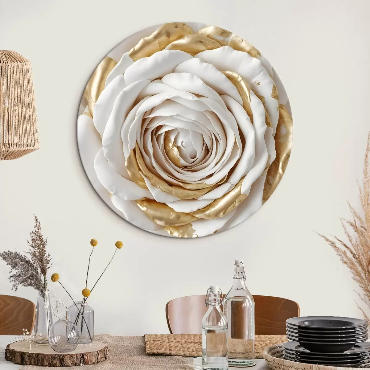 Quadri rotondi Una rosa decorativa minimalista bianca con accenti gialli, i petali sono stratificati e arricciati r43160