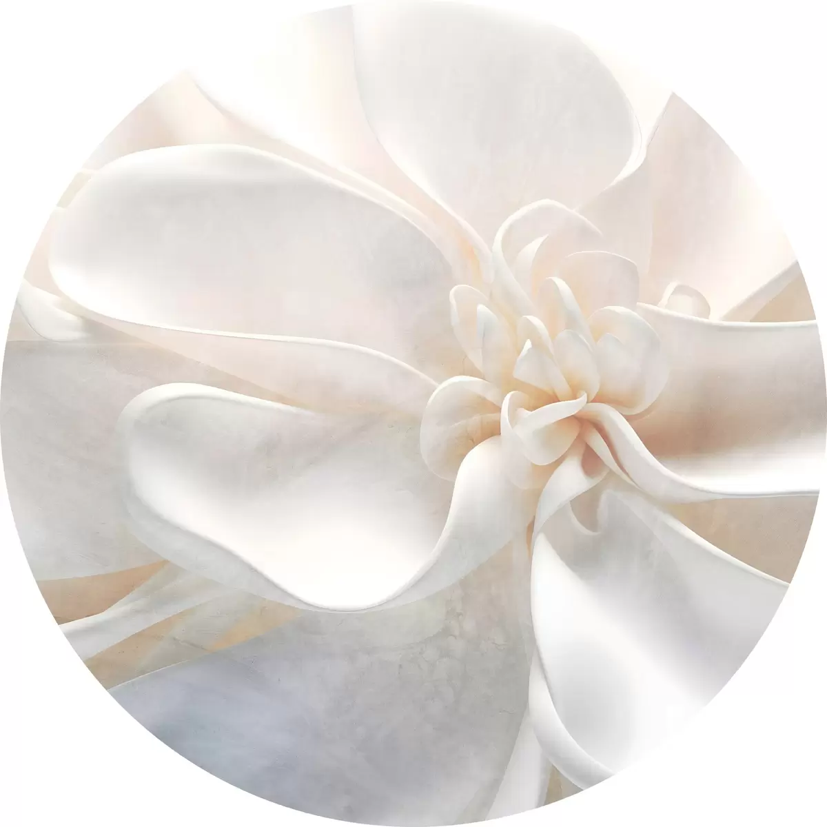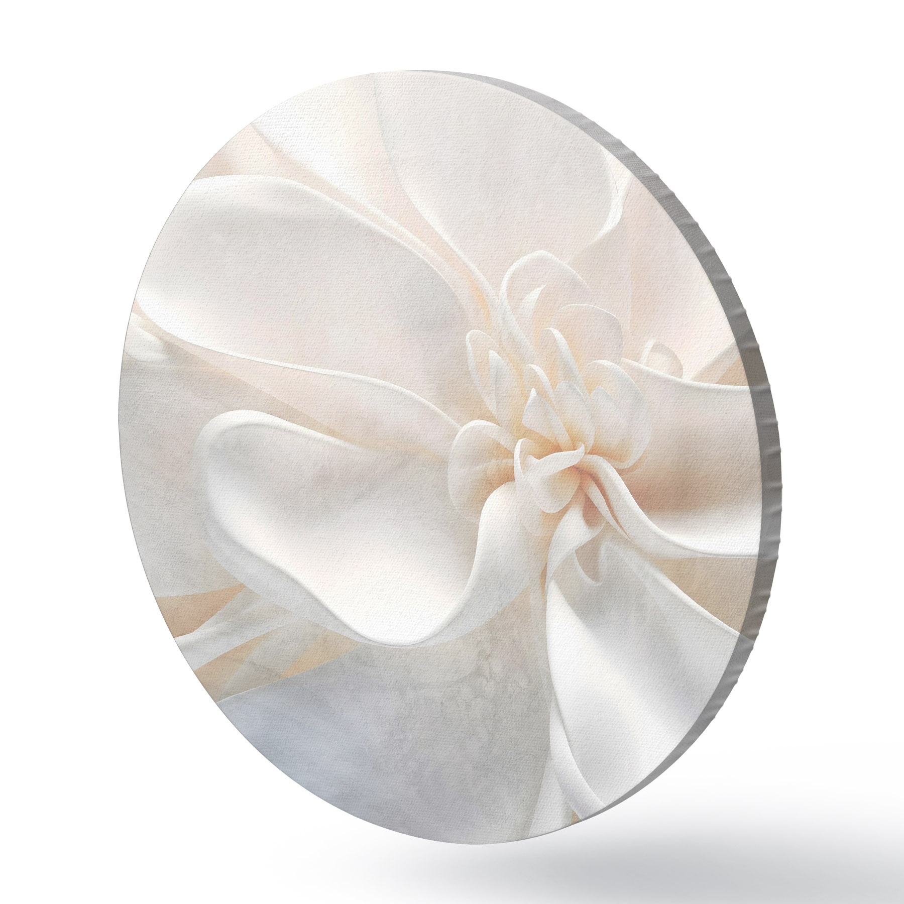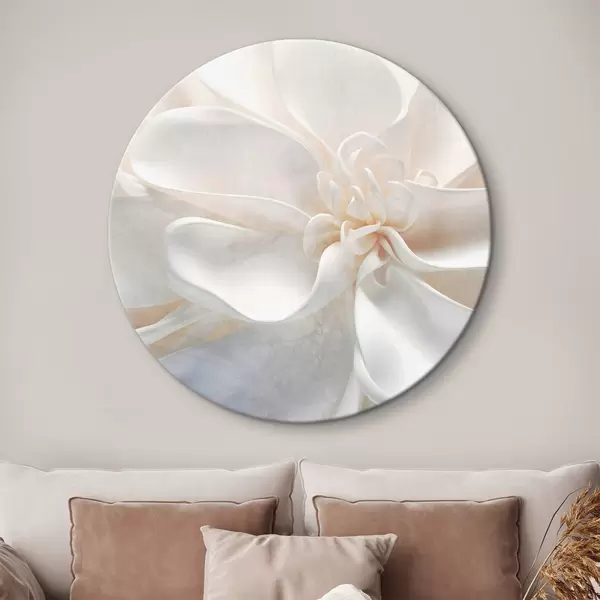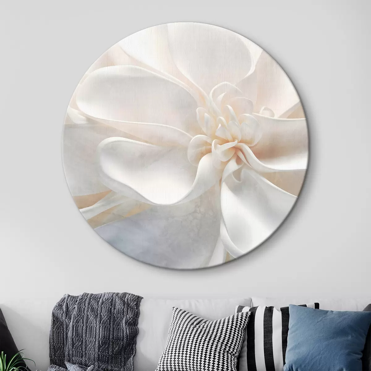 Quadri rotondi Primo piano di un fiore astratto bianco dalla texture rumorosa con petali delicati in colori pastello r43161