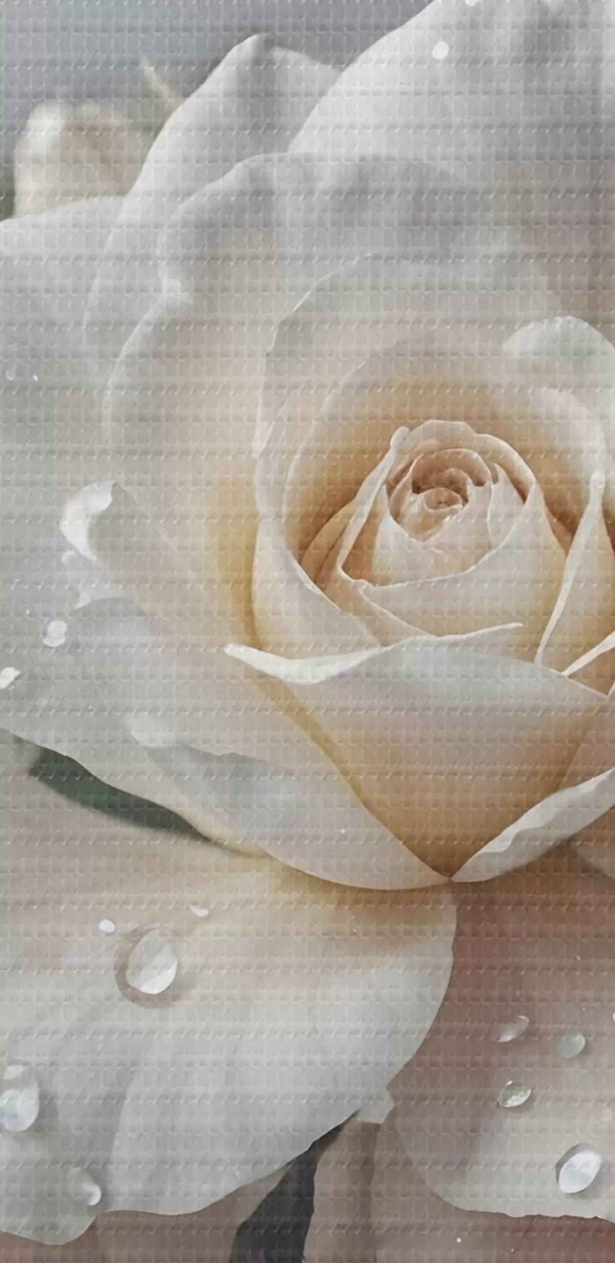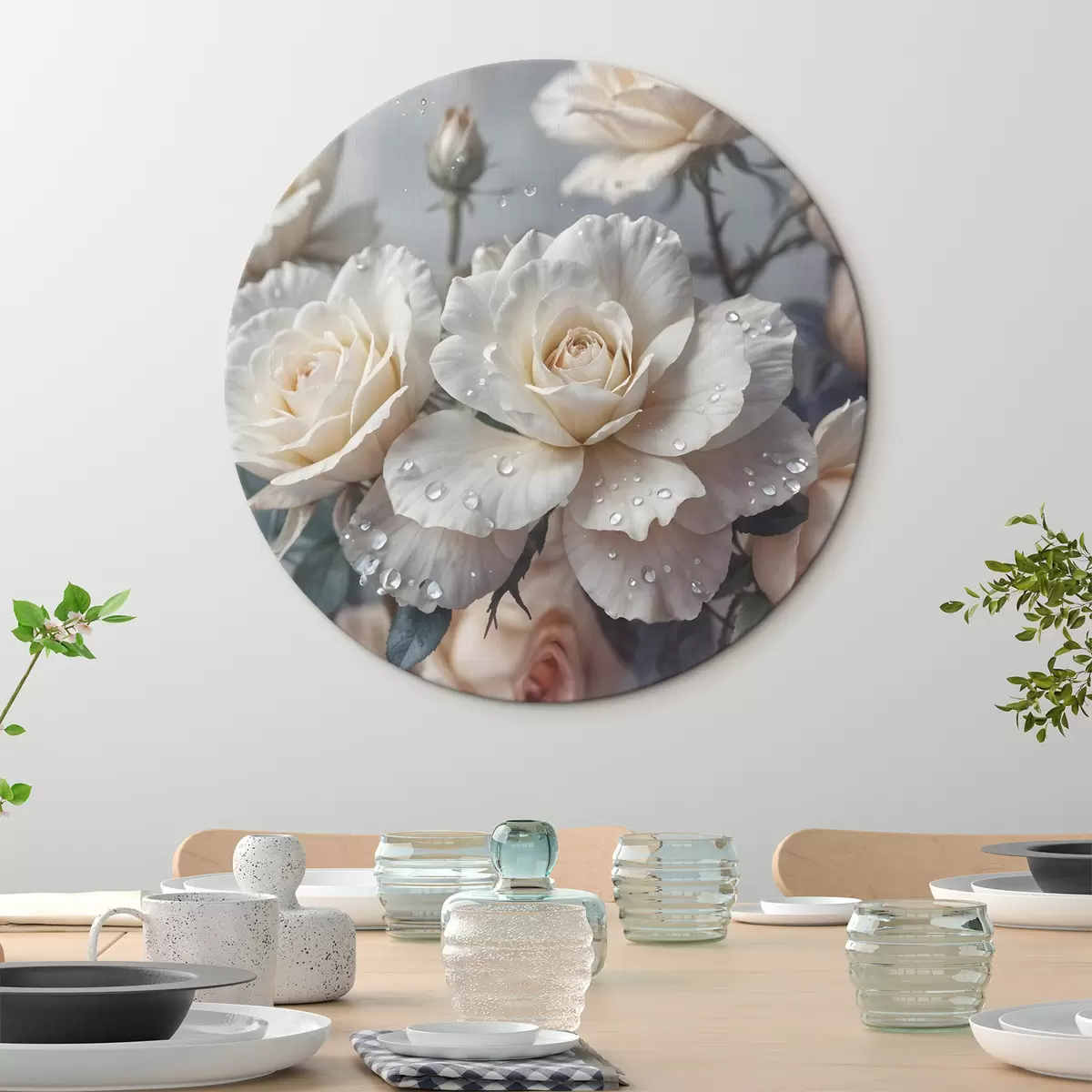 Quadri rotondi Un gruppo di rose bianche con gocce d'acqua sui petali, alcune foglie verdi, sfondo tenue, luce soffusa r43163