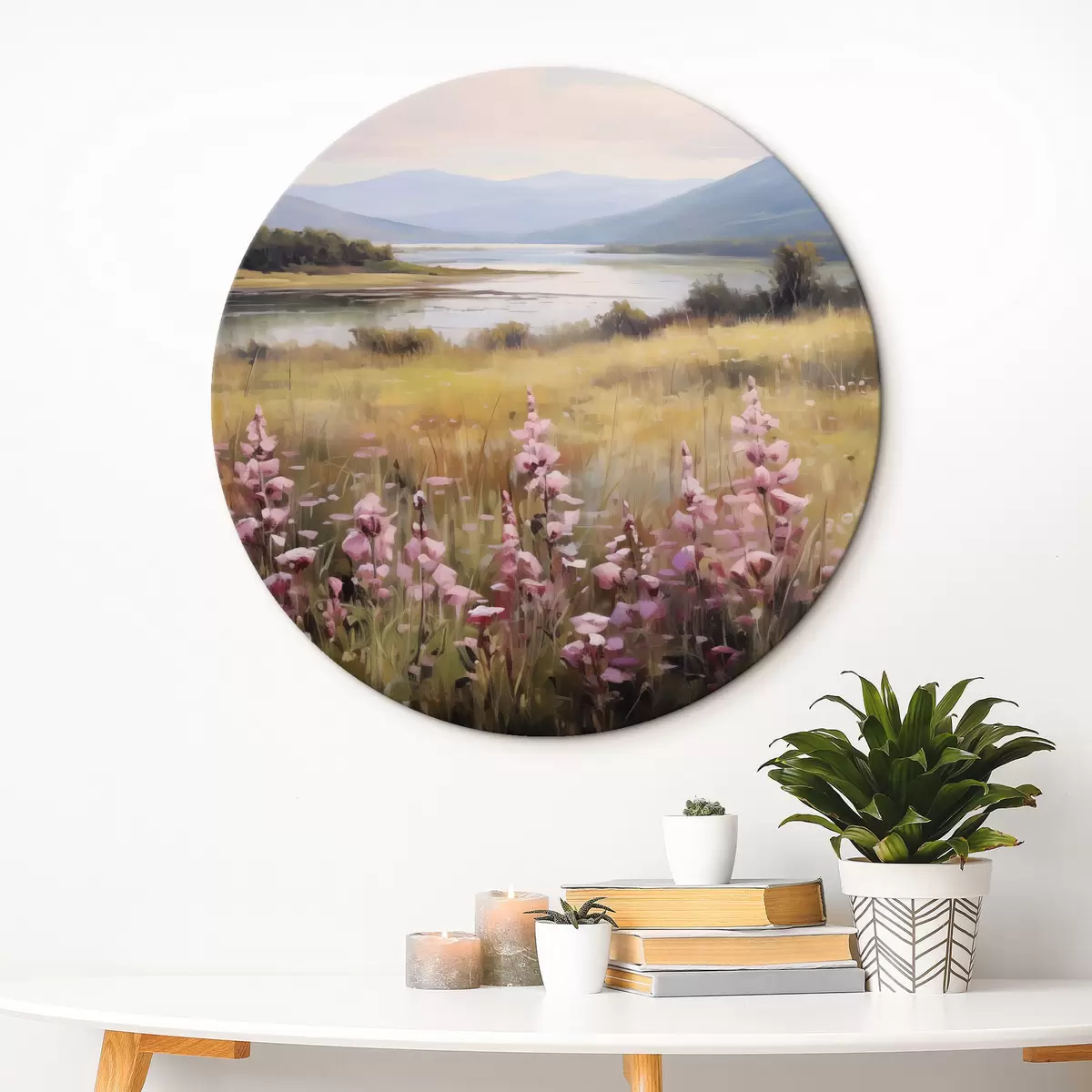 Quadri rotondi Un paesaggio con un campo di fiori rosa, un lago e montagne sullo sfondo, sotto un cielo nuvoloso r43165
