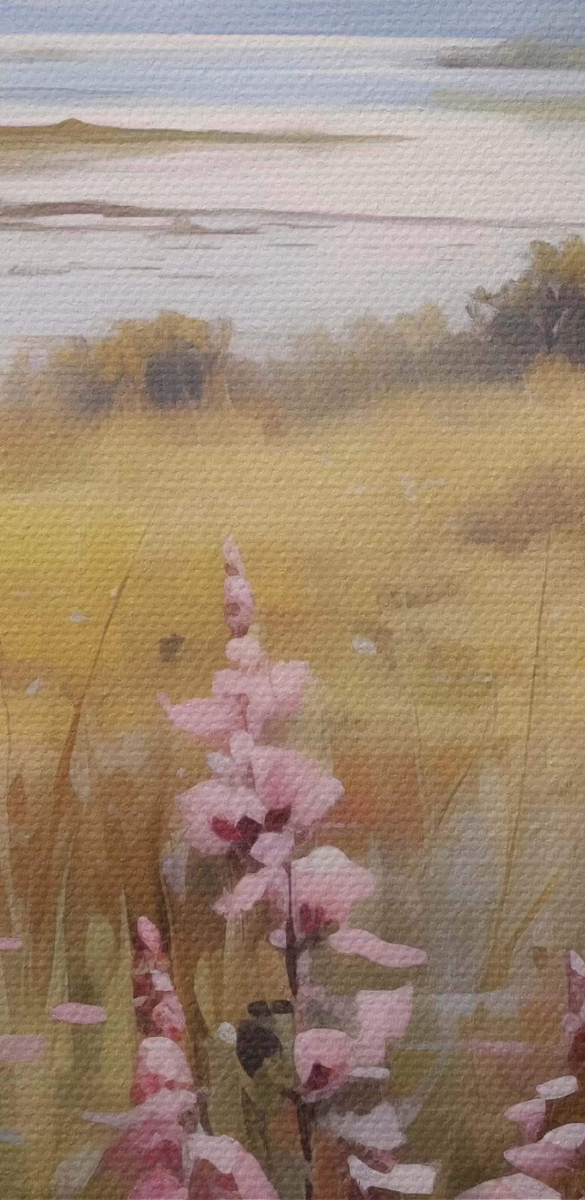 Immagine Un paesaggio con un campo di fiori rosa, un lago e montagne sullo sfondo, sotto un cielo nuvoloso Nr r43165