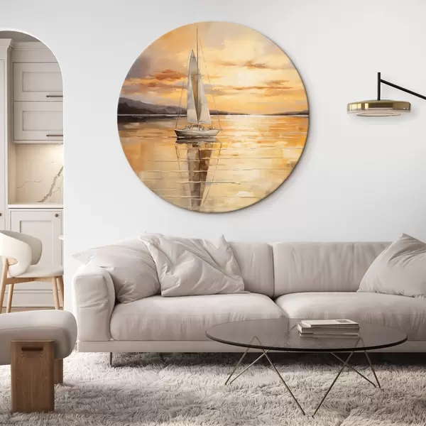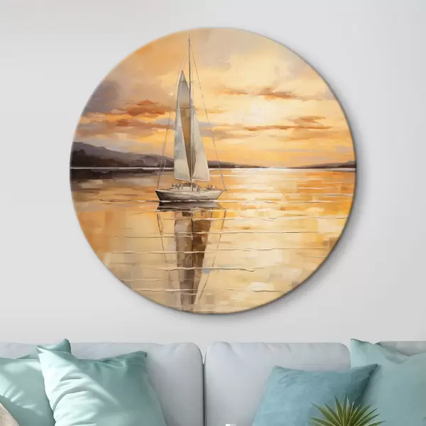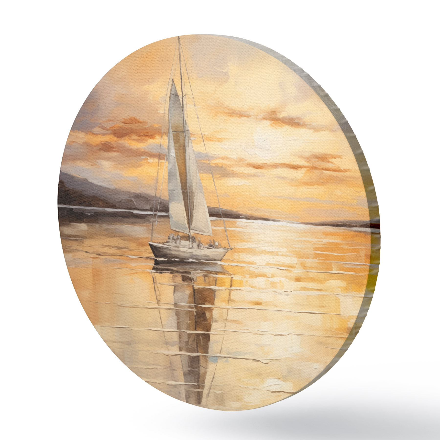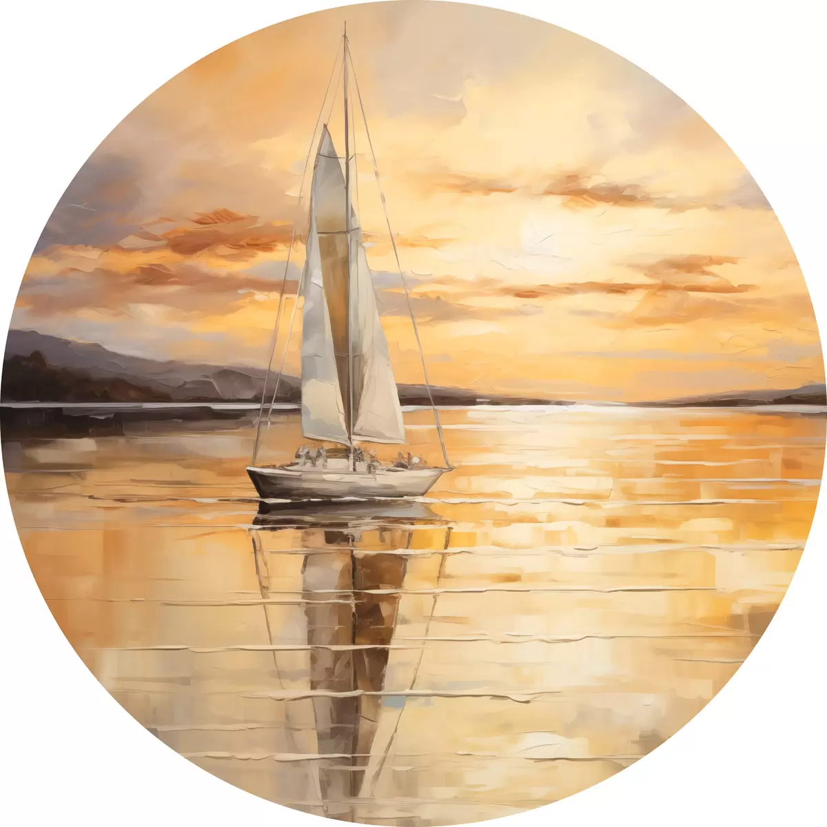 Quadri rotondi Paesaggio dipinto con una barca a vela su un mare calmo, cielo arancione e giallo, montagne lontane r43169