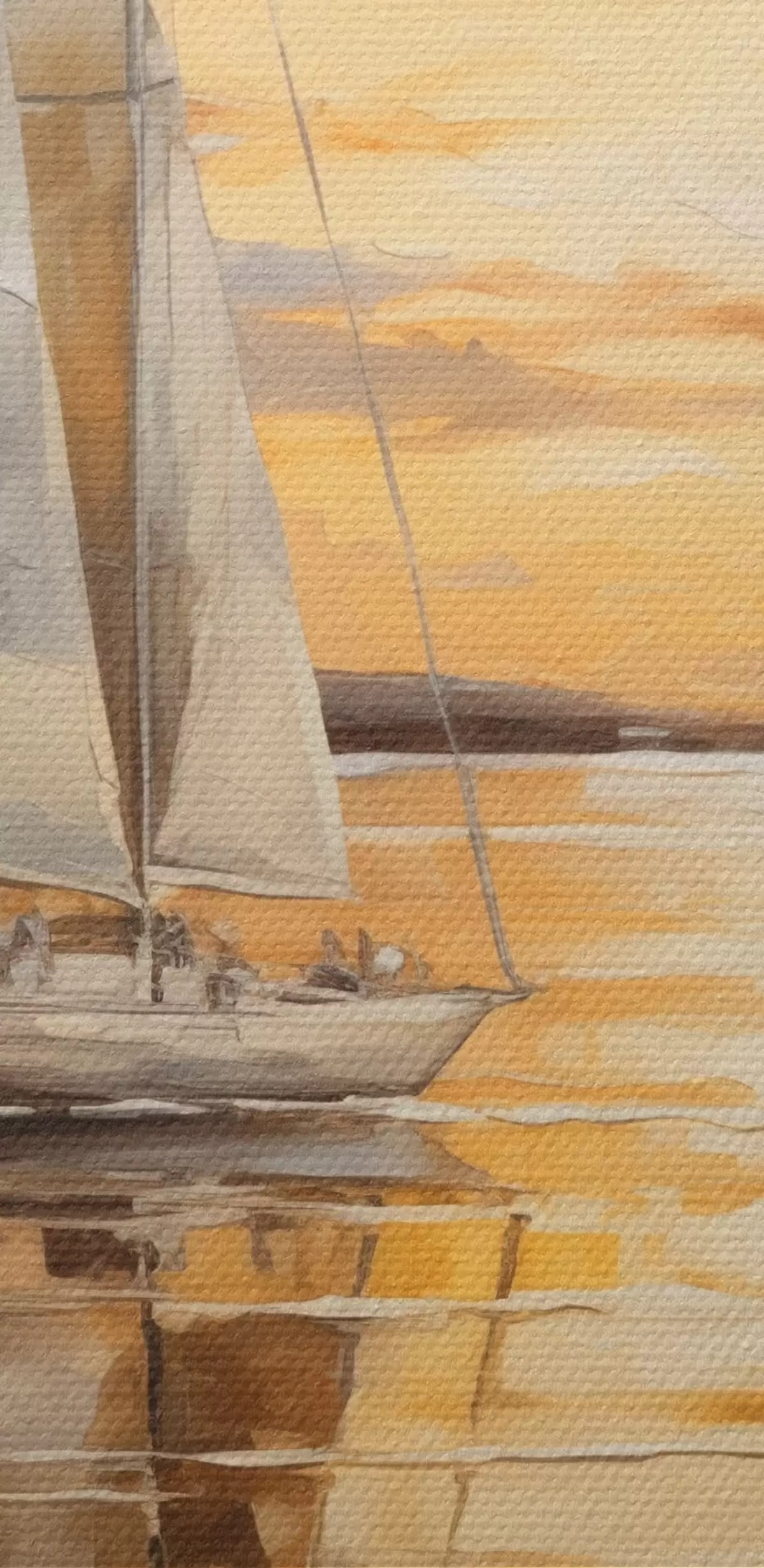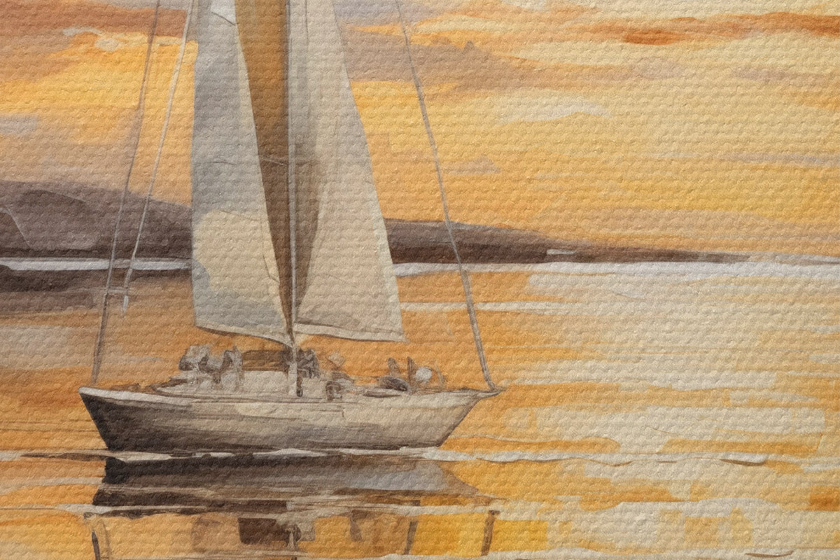 Immagine Paesaggio dipinto con una barca a vela su un mare calmo, cielo arancione e giallo, montagne lontane Nr r43169
