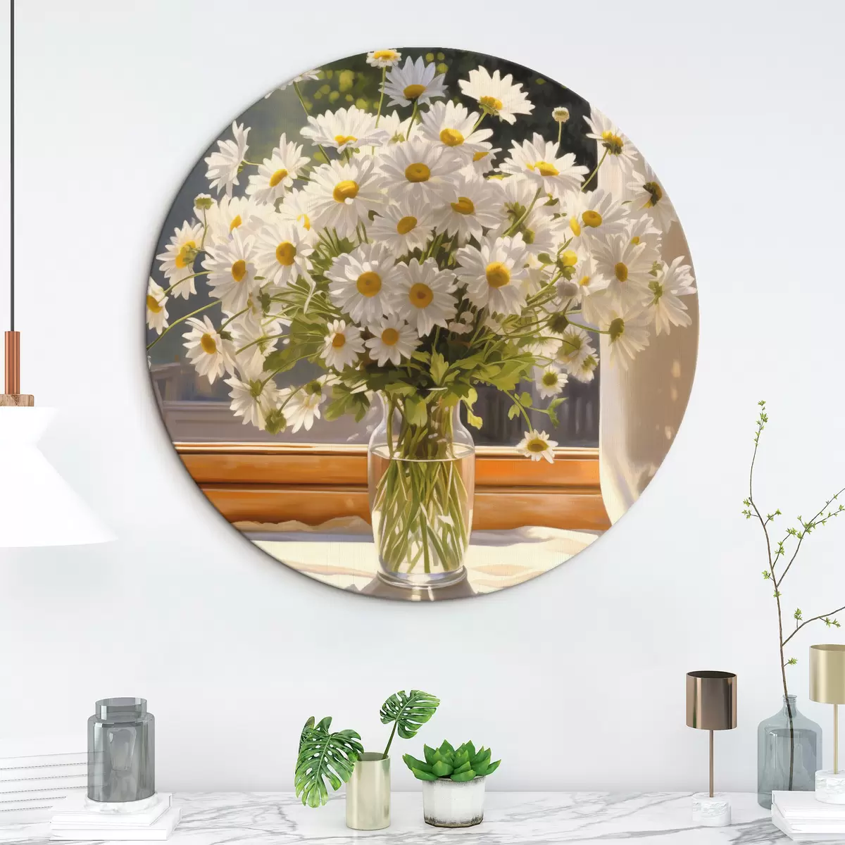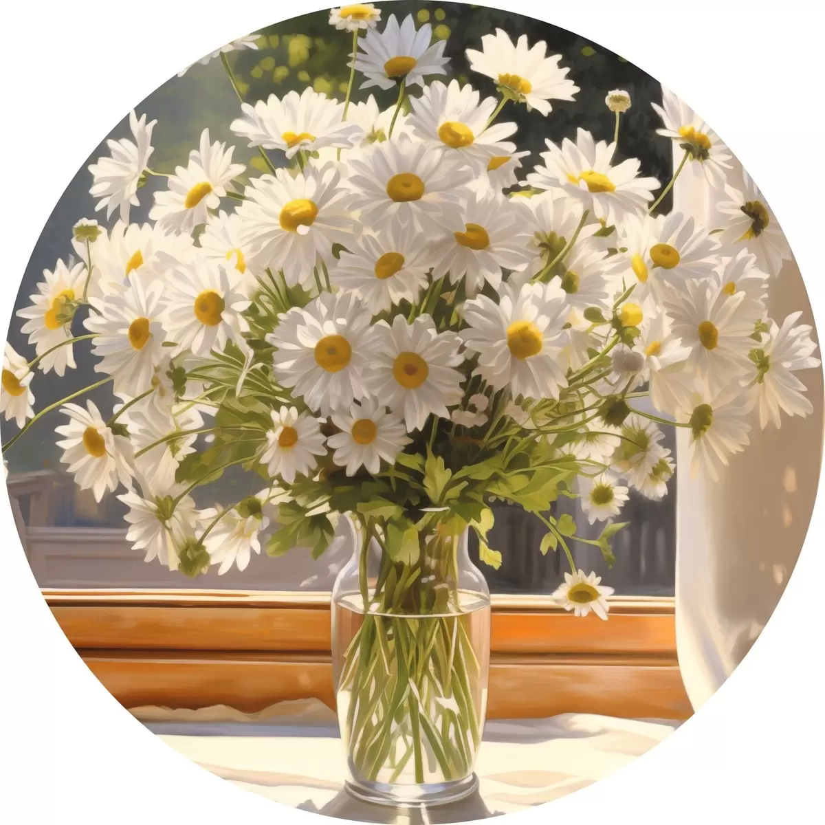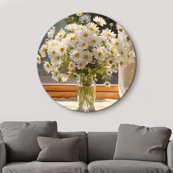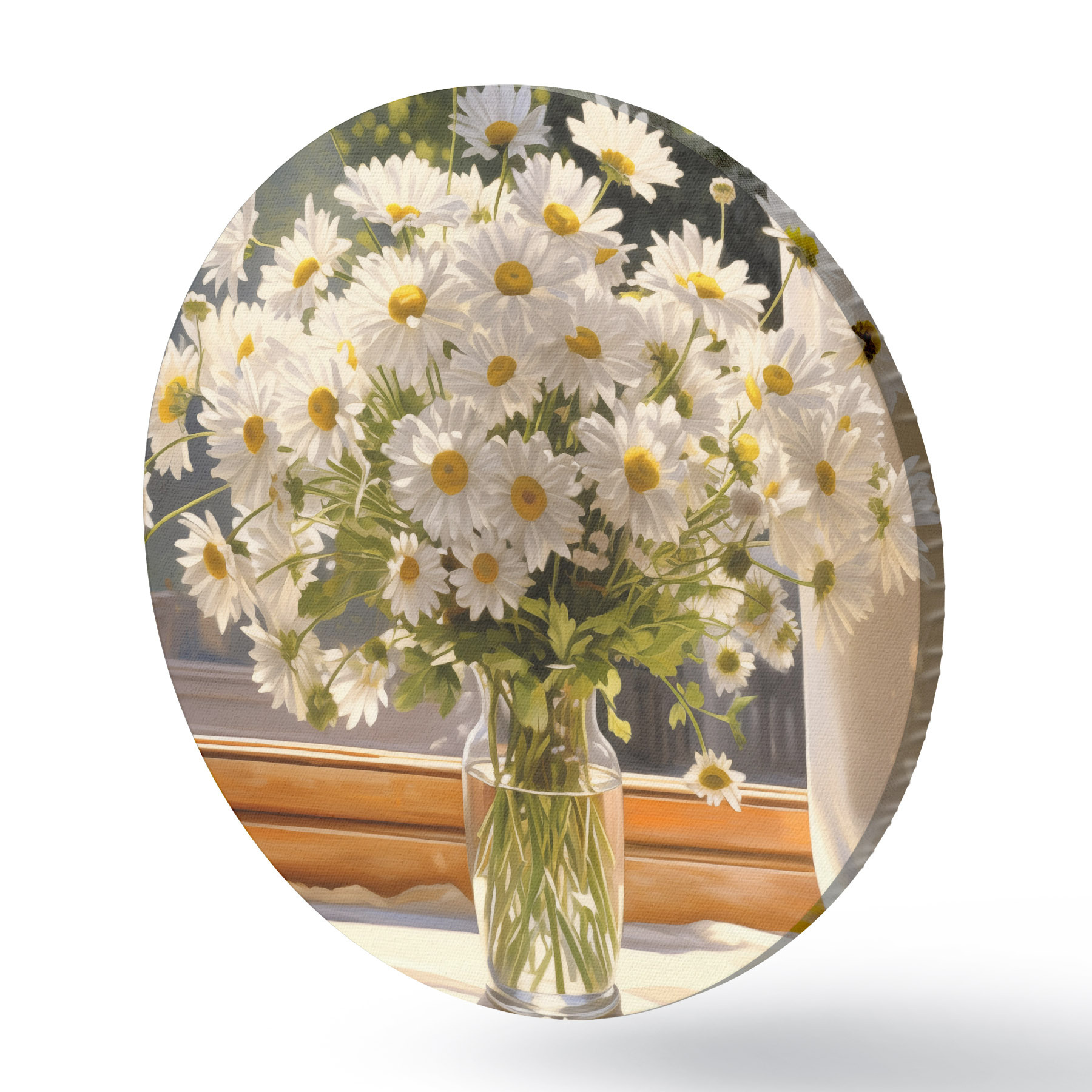 Quadri rotondi Pittura a olio imitazione di un vaso con margherite bianche su un davanzale, giornata di sole, tavolozza di colori caldi r43171