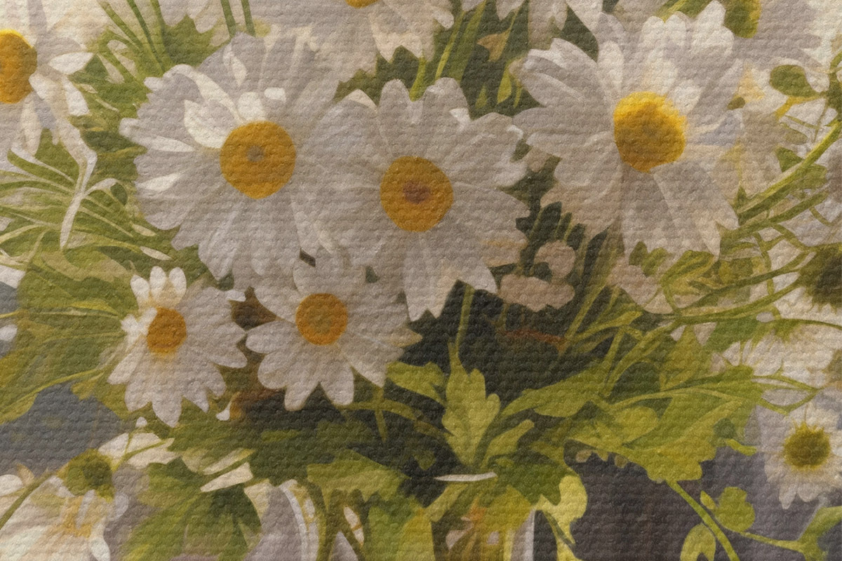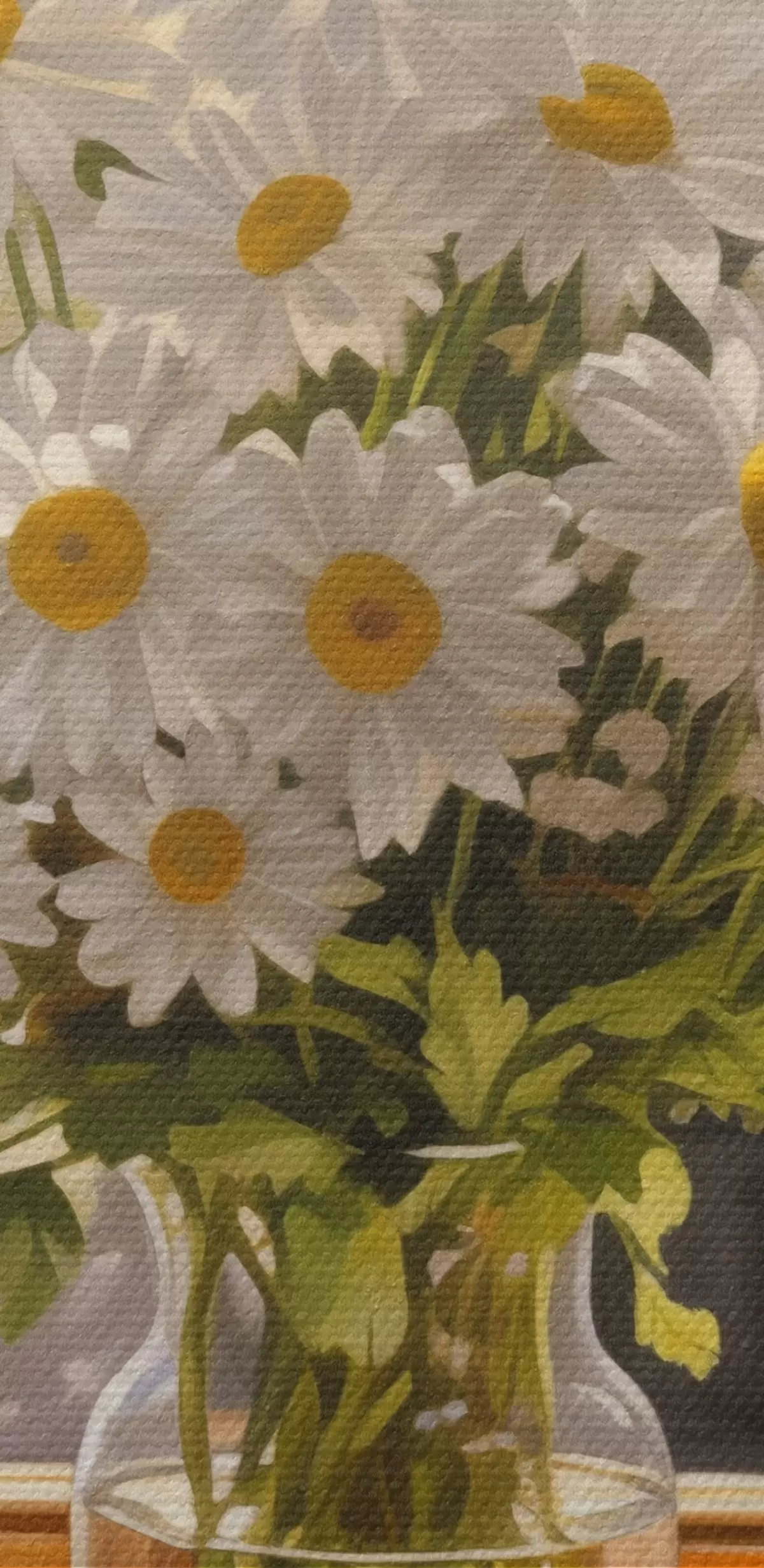 Immagine Pittura a olio imitazione di un vaso con margherite bianche su un davanzale, giornata di sole, tavolozza di colori caldi Nr r43171