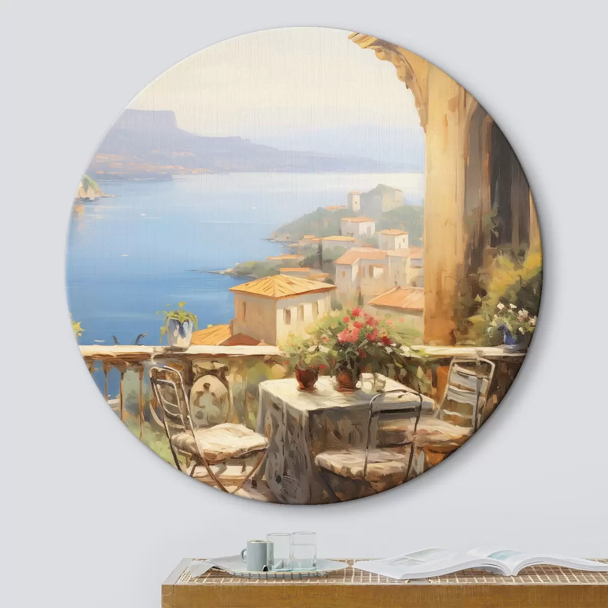 Quadri rotondi Pittura ad olio imitazione di balcone con fiori, con vista sul mare, case sulla costa, giornata di sole, cielo blu r43173