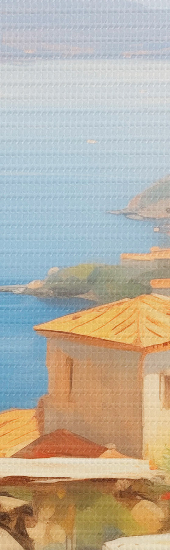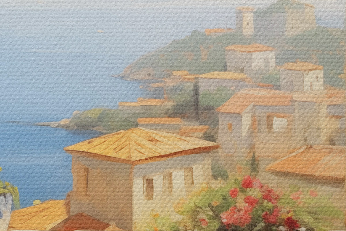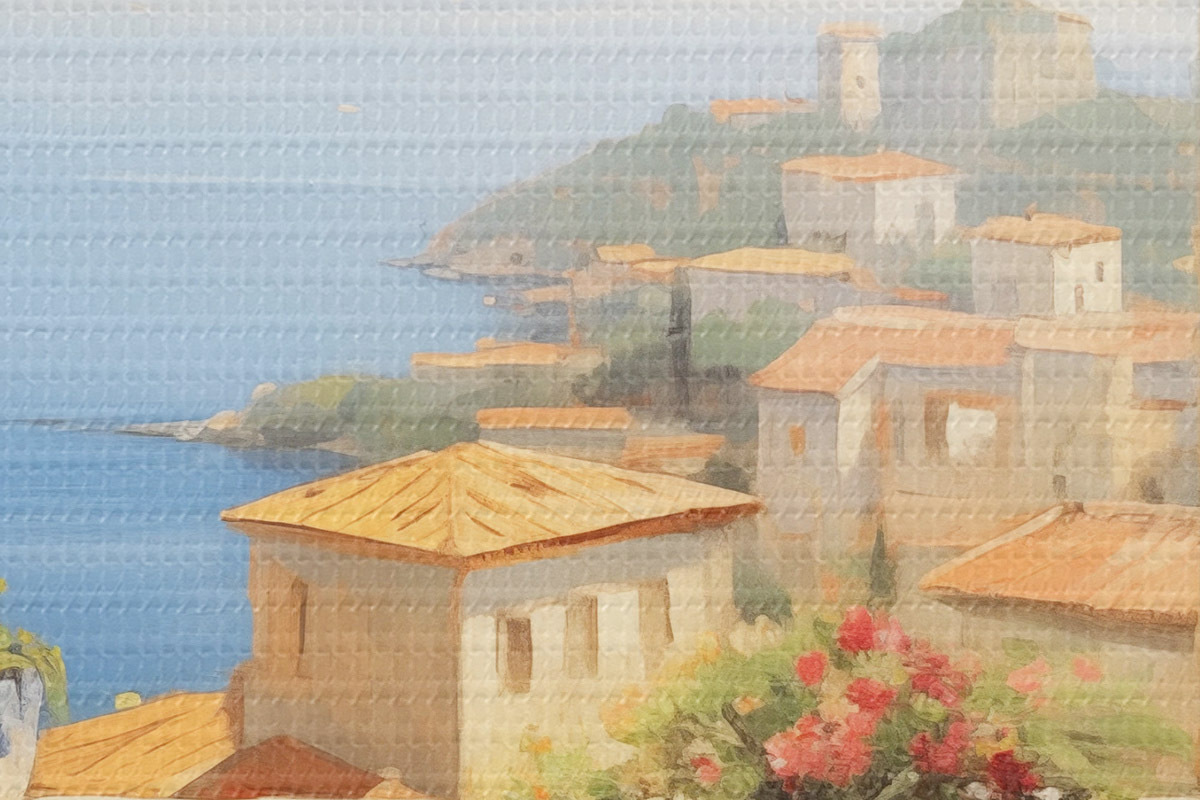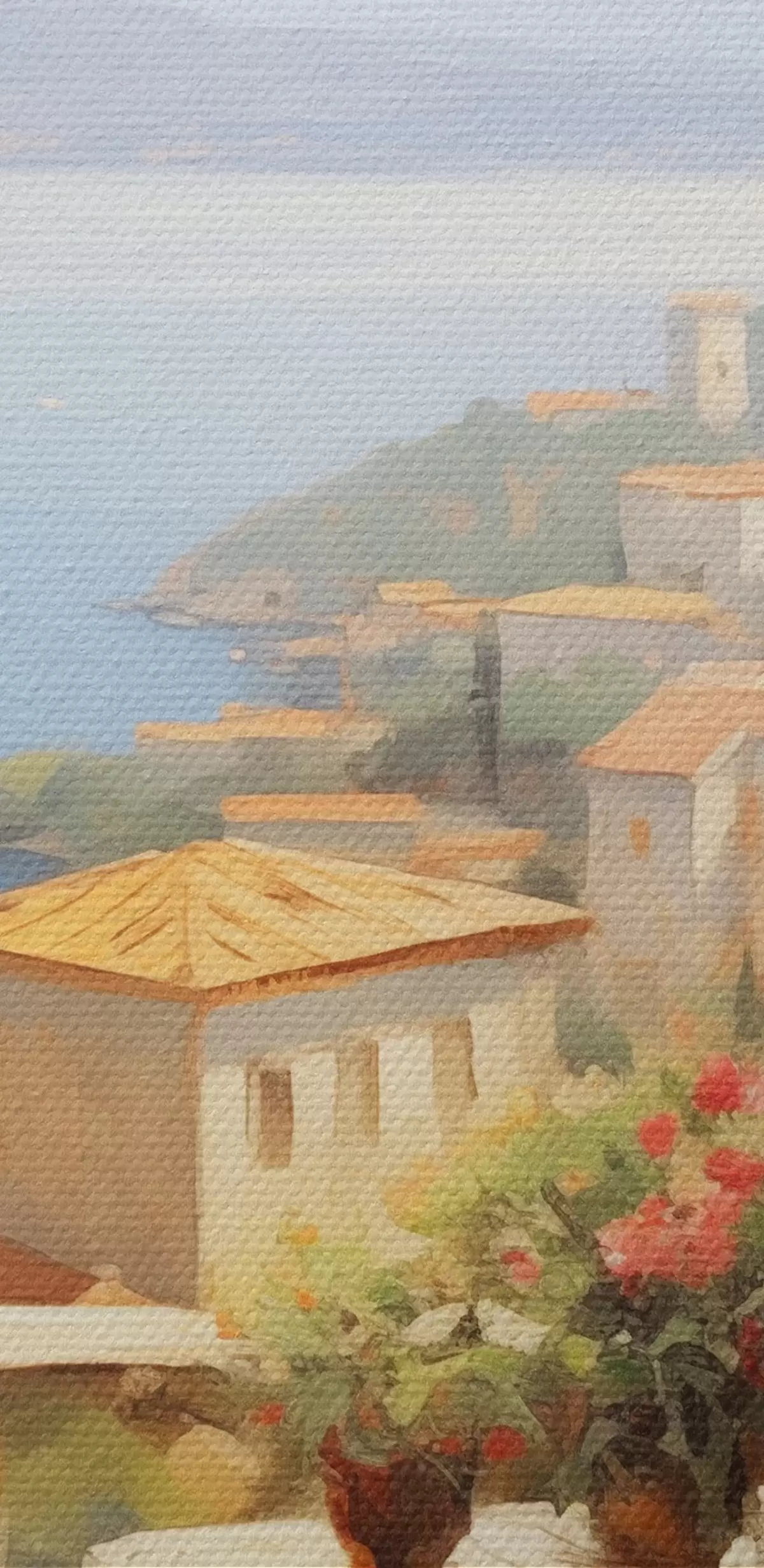 Immagine Pittura ad olio imitazione di balcone con fiori, con vista sul mare, case sulla costa, giornata di sole, cielo blu Nr r43173