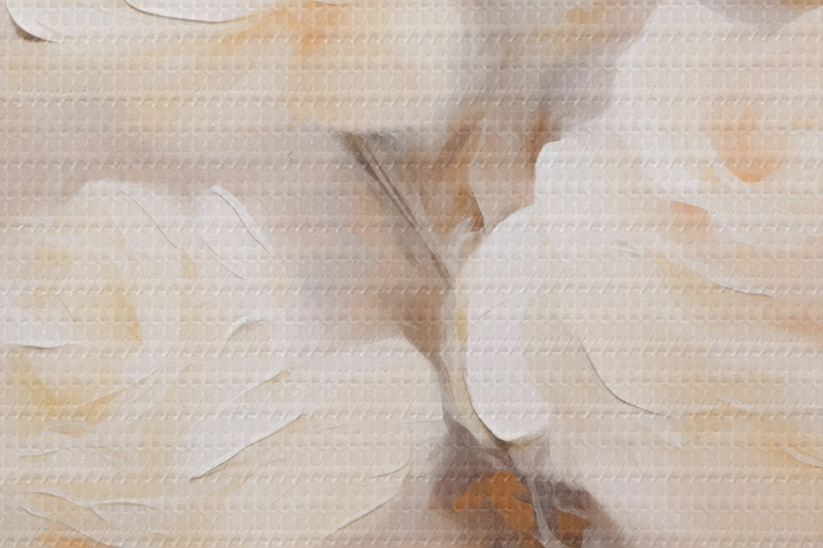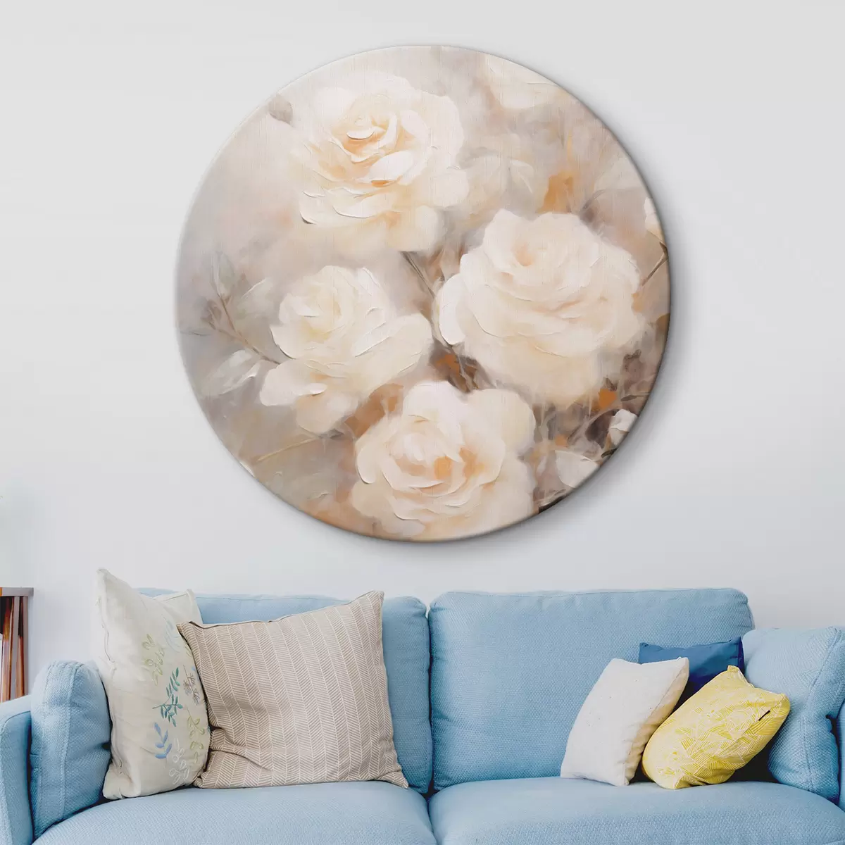 Quadri rotondi Rose bianche con petali morbidi, con uno sfondo di colori tenui e forme sfocate, che creano un effetto sognante r43177