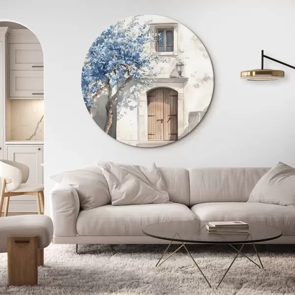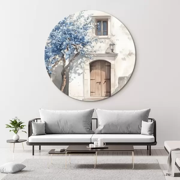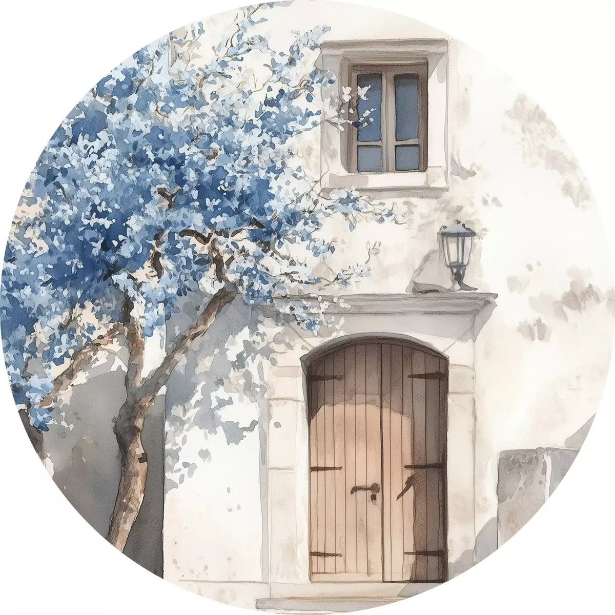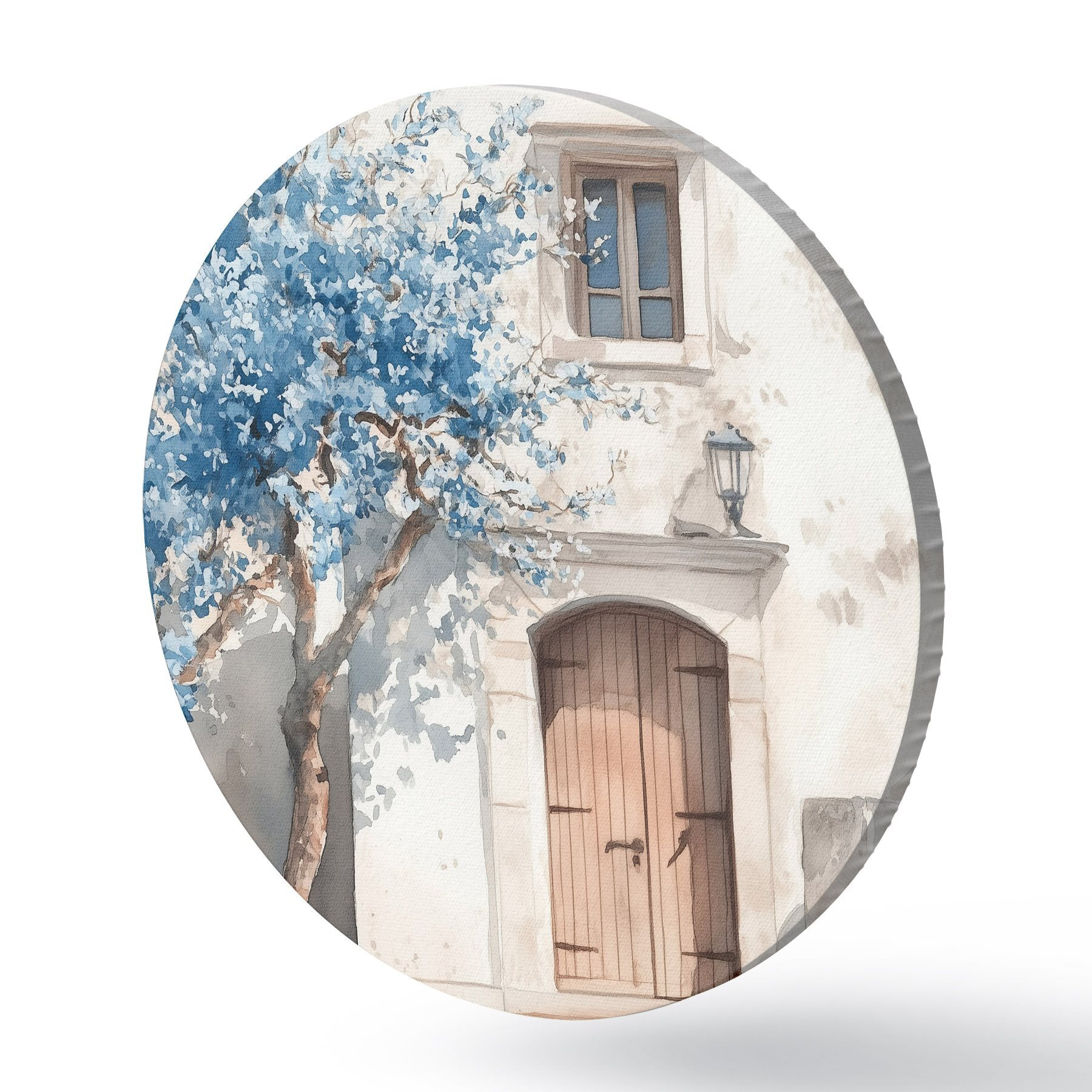 Quadri rotondi Casa greca con bell'albero, architettura, stile acquerello r43178