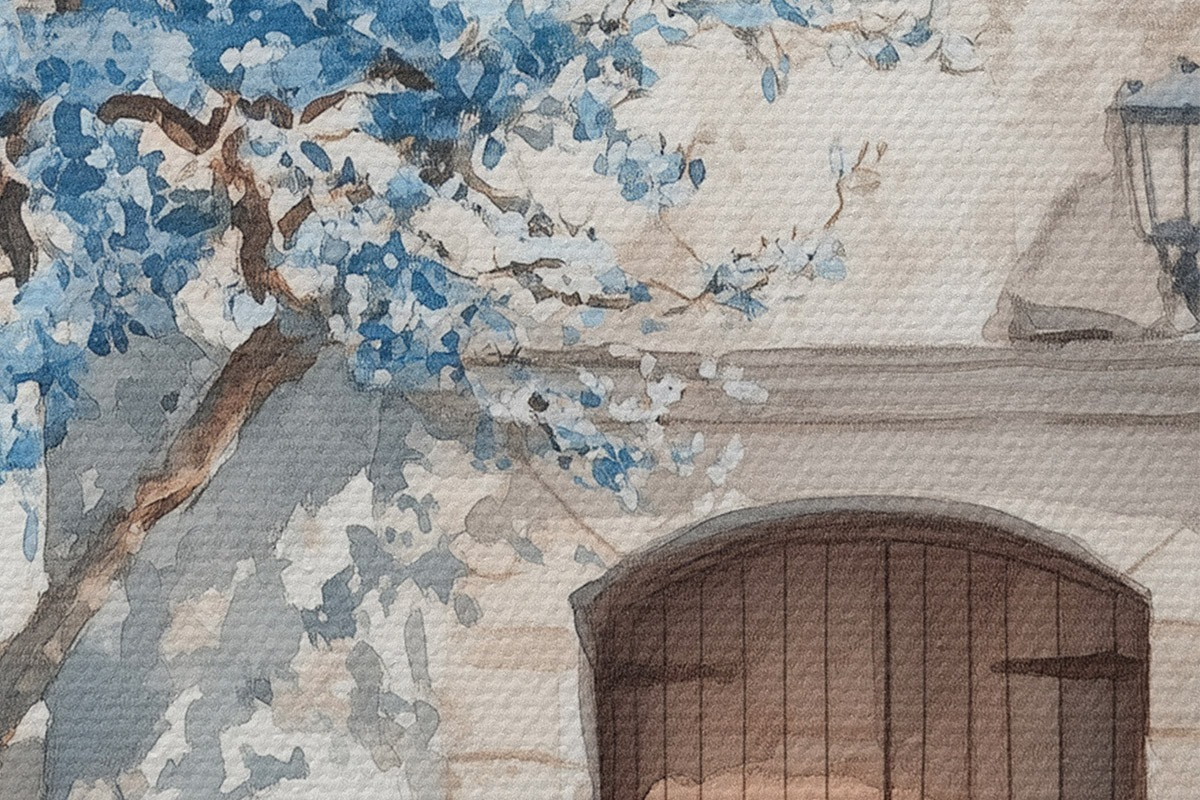 Immagine Casa greca con bell'albero, architettura, stile acquerello Nr r43178