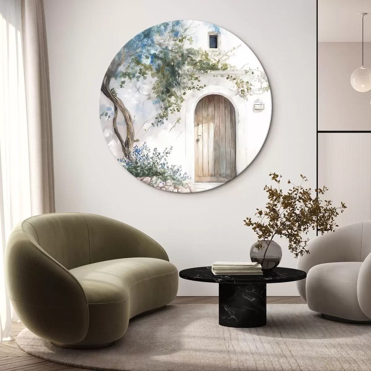 Quadri rotondi Bella casa bianca con albero in fiore, stile mediterraneo, acquerello r43179