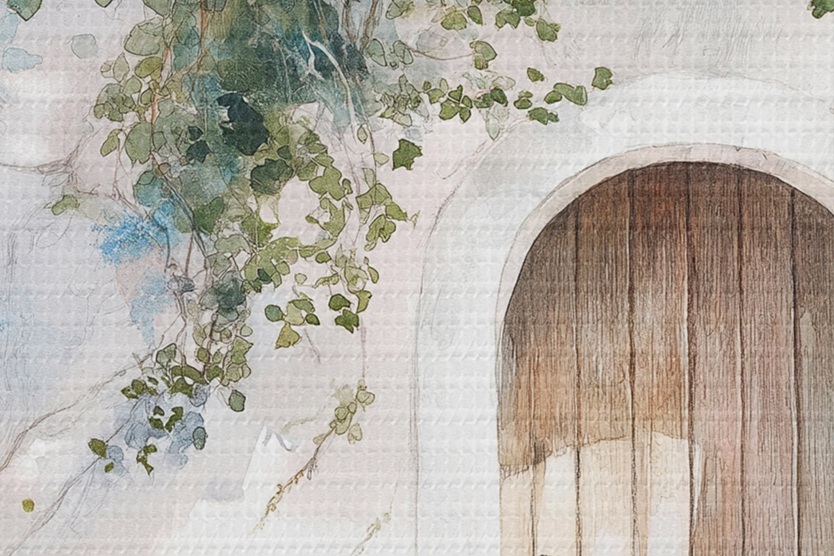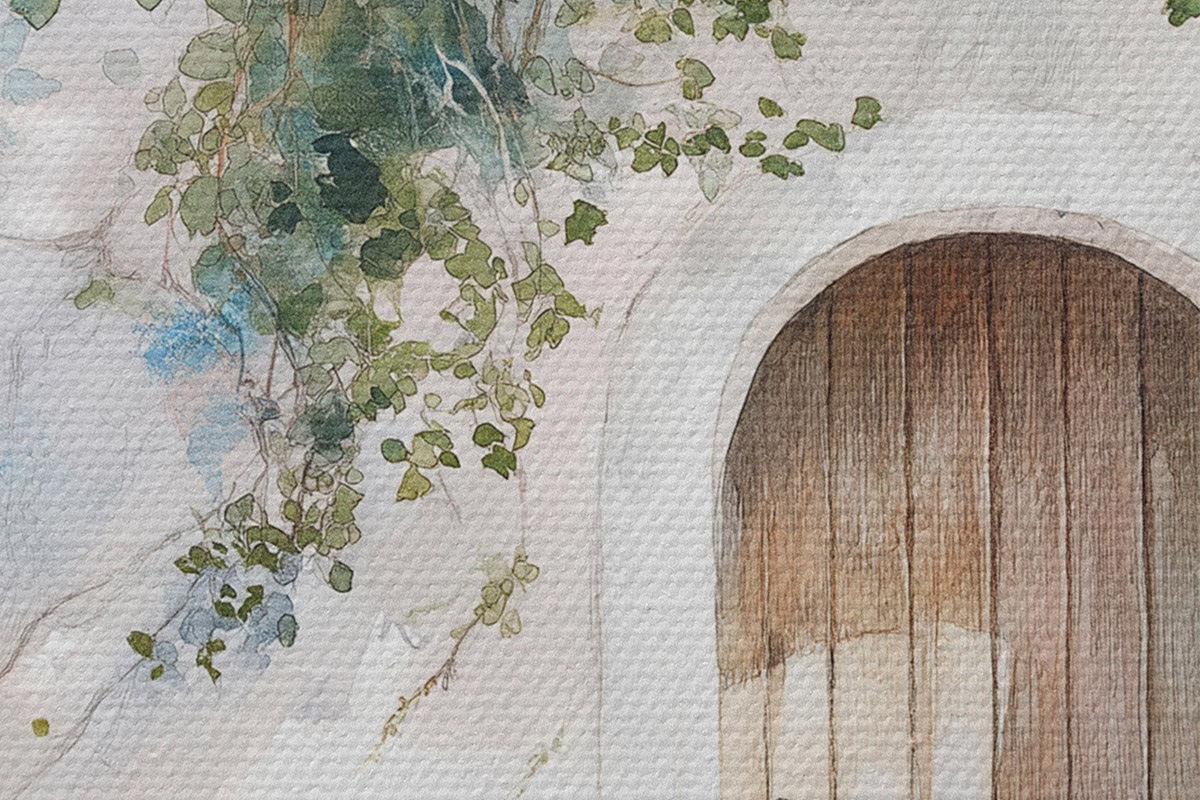 Immagine Bella casa bianca con albero in fiore, stile mediterraneo, acquerello Nr r43179