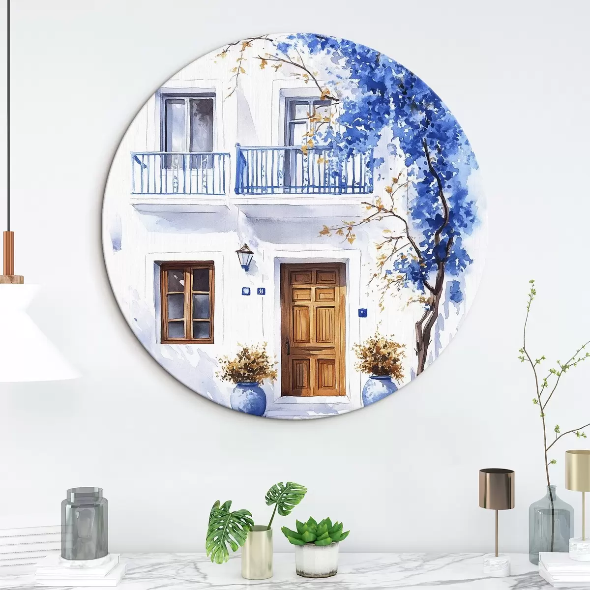 Quadri rotondi Albero in fiore con fiori blu, casa bianca, Grecia, stile acquerello r43183