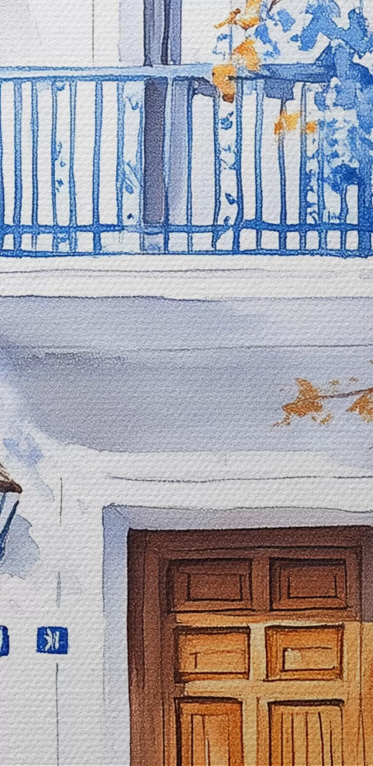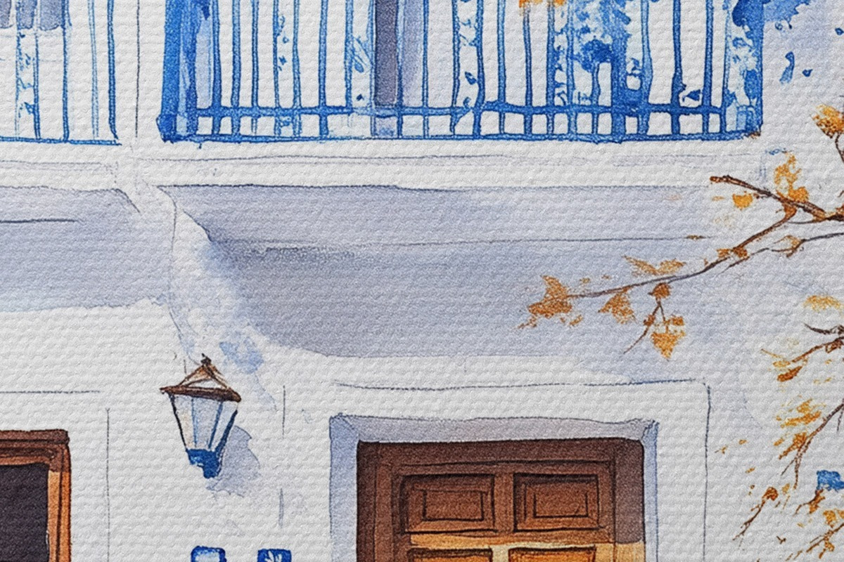 Immagine Albero in fiore con fiori blu, casa bianca, Grecia, stile acquerello Nr r43183