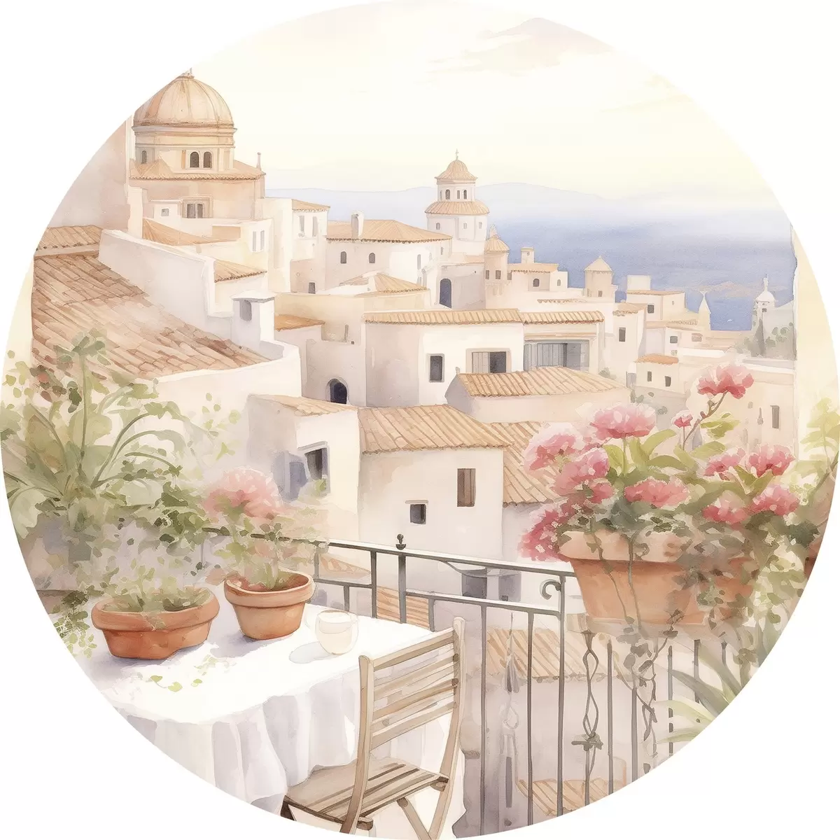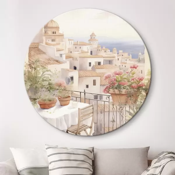 Quadri rotondi Tramonto sul balcone, Italia, architettura, fiori in fiore, stile acquerello r43184