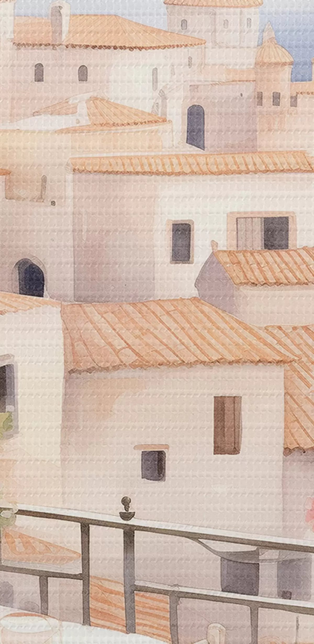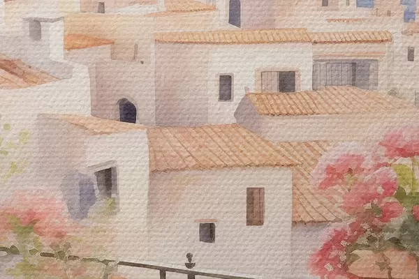 Immagine Tramonto sul balcone, Italia, architettura, fiori in fiore, stile acquerello Nr r43184