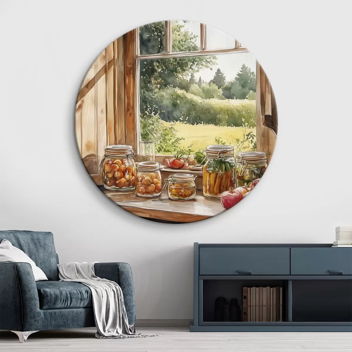 Quadri rotondi Estetica del villaggio, casa di legno, natura estiva, verdure, stile acquerello r43185