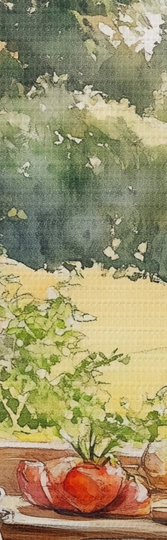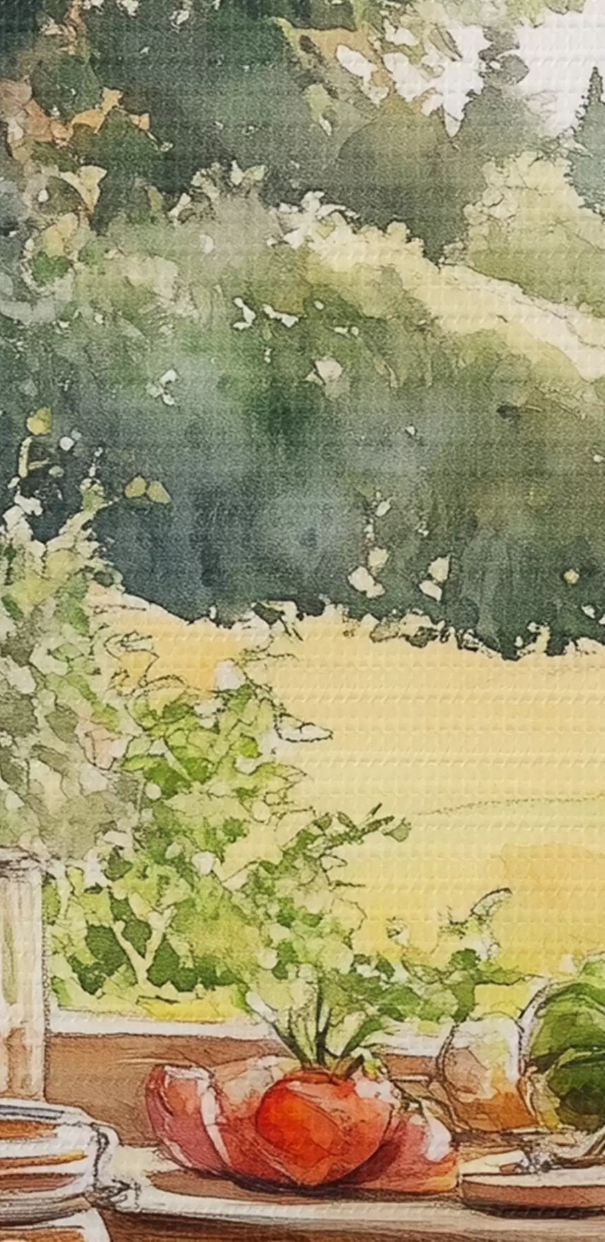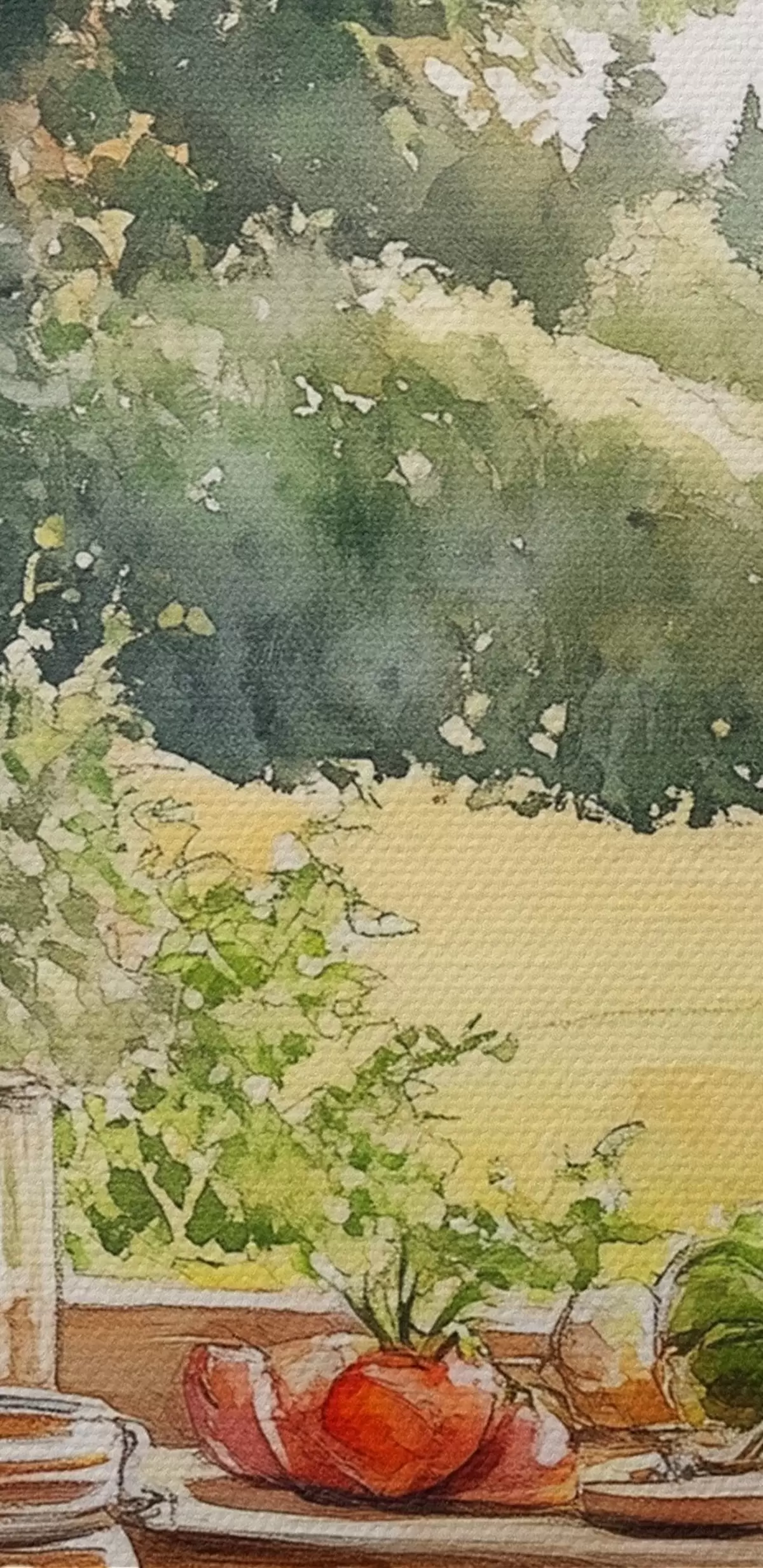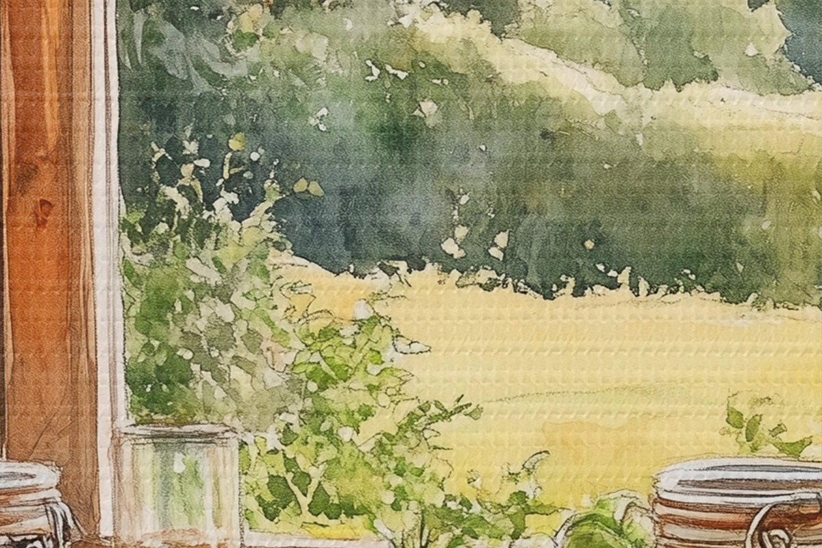 Immagine Estetica del villaggio, casa di legno, natura estiva, verdure, stile acquerello Nr r43185
