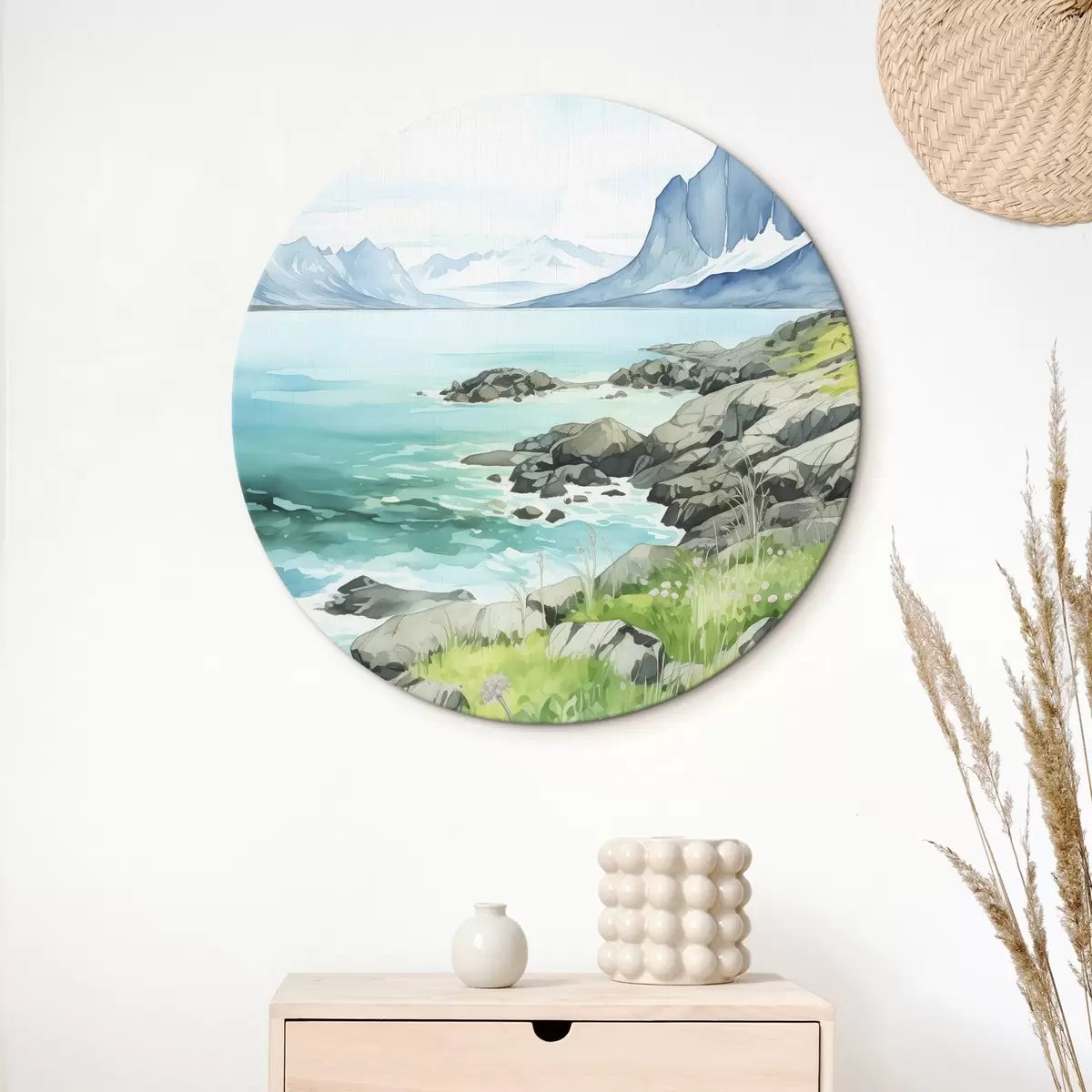 Quadri rotondi Norvegia natura, fiordi, paesaggio estivo, erba verde, montagne, stile acquerello r43188