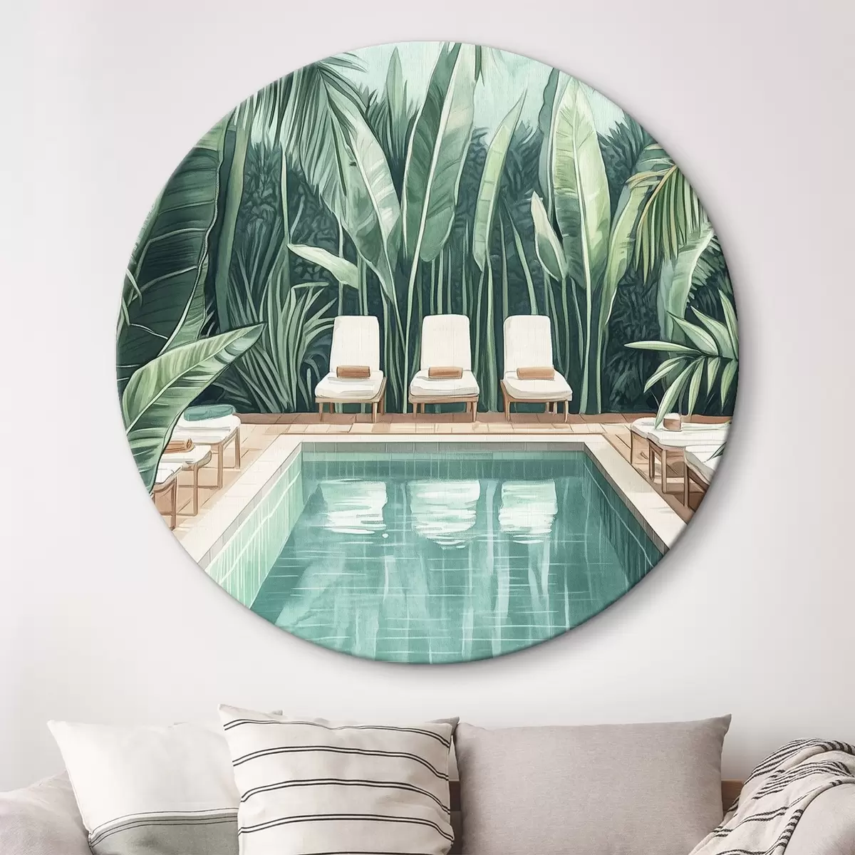 Quadri rotondi Piscina estiva estetica nel giardino tropicale, stile acquerello r43192