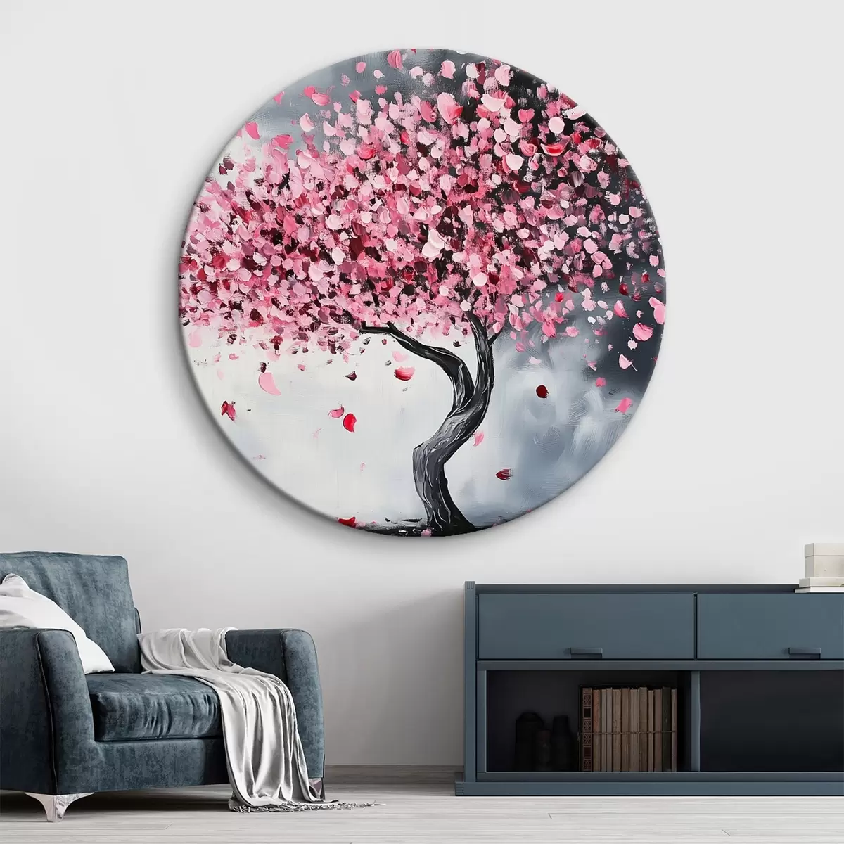 Quadri rotondi Albero fiorito rosa su sfondo grigio r43299