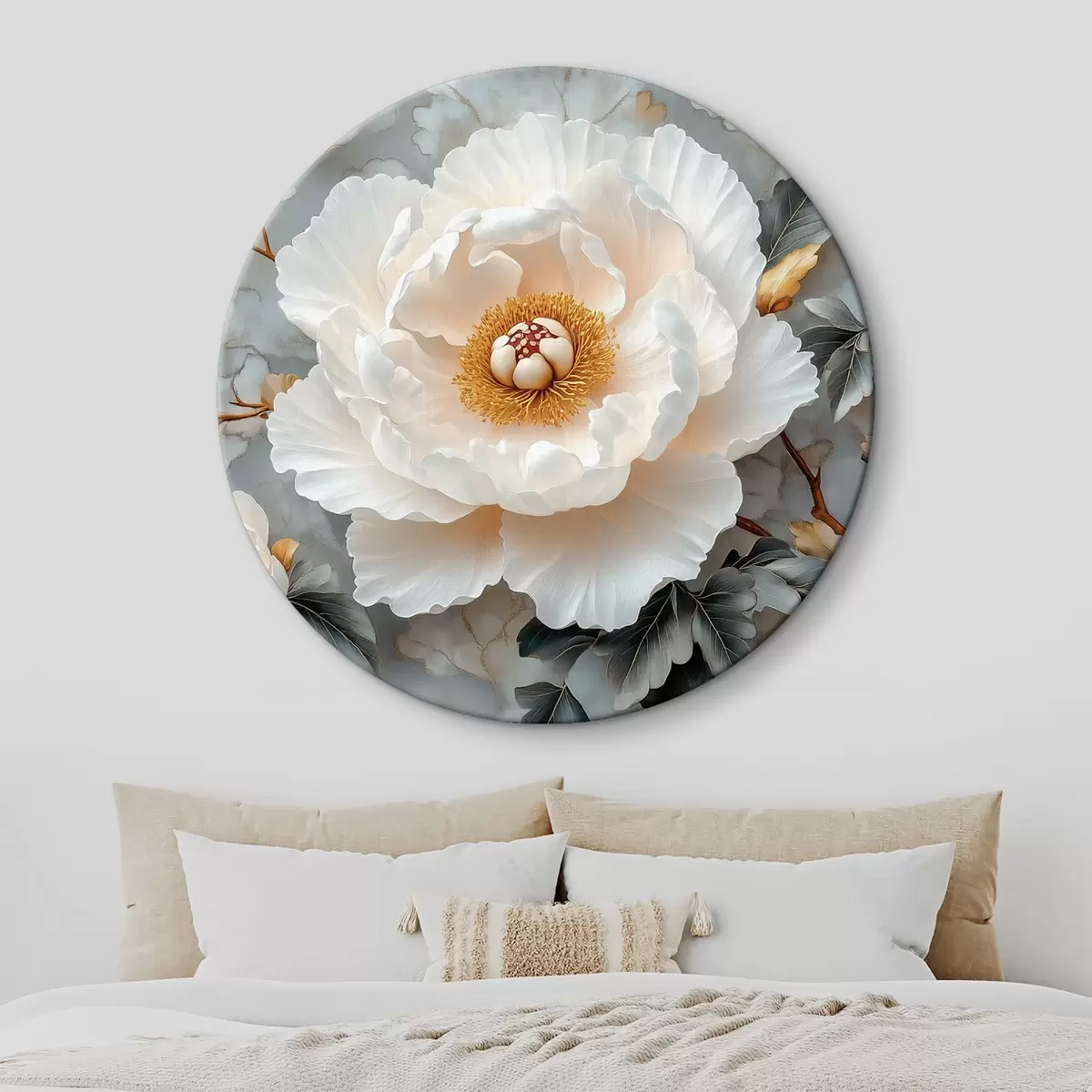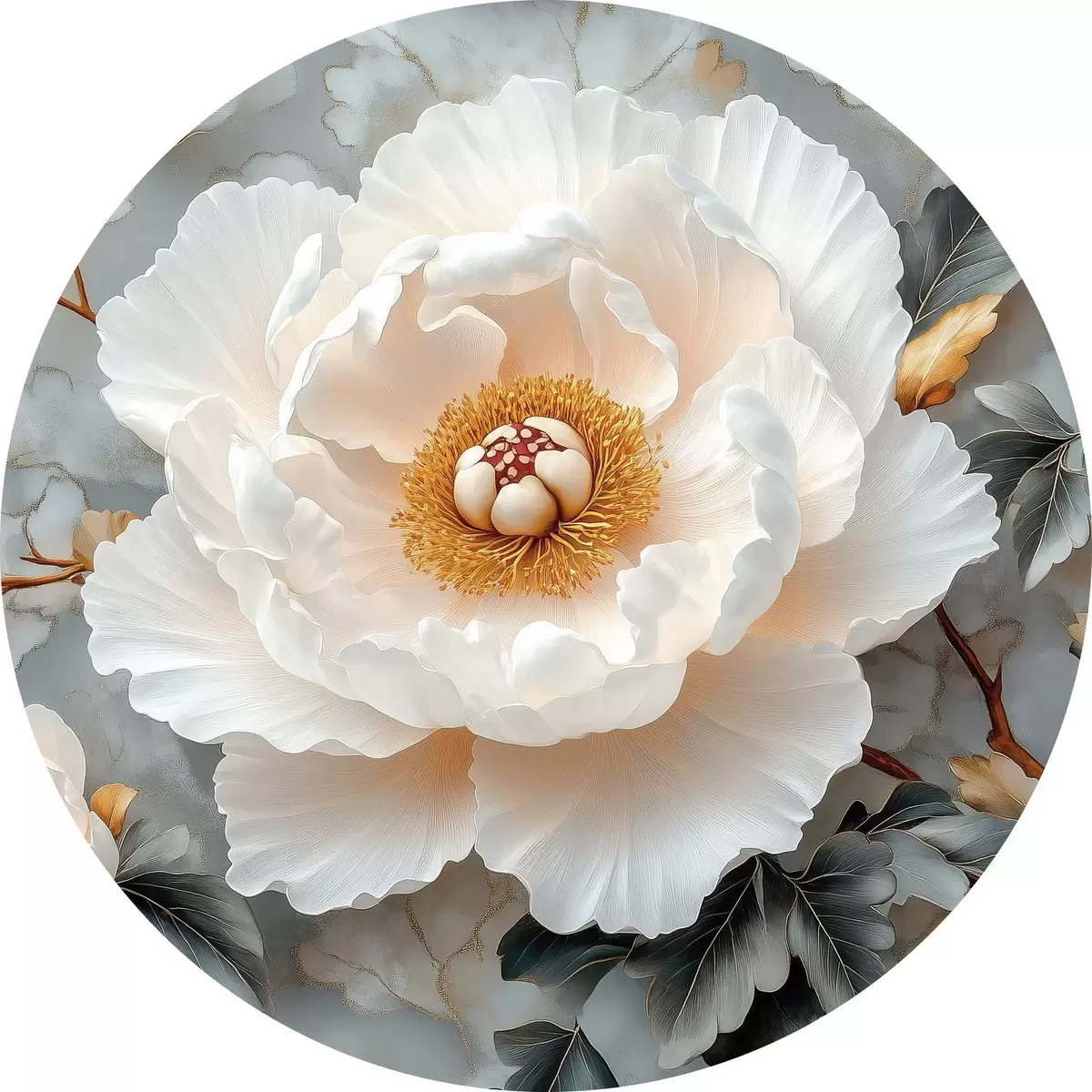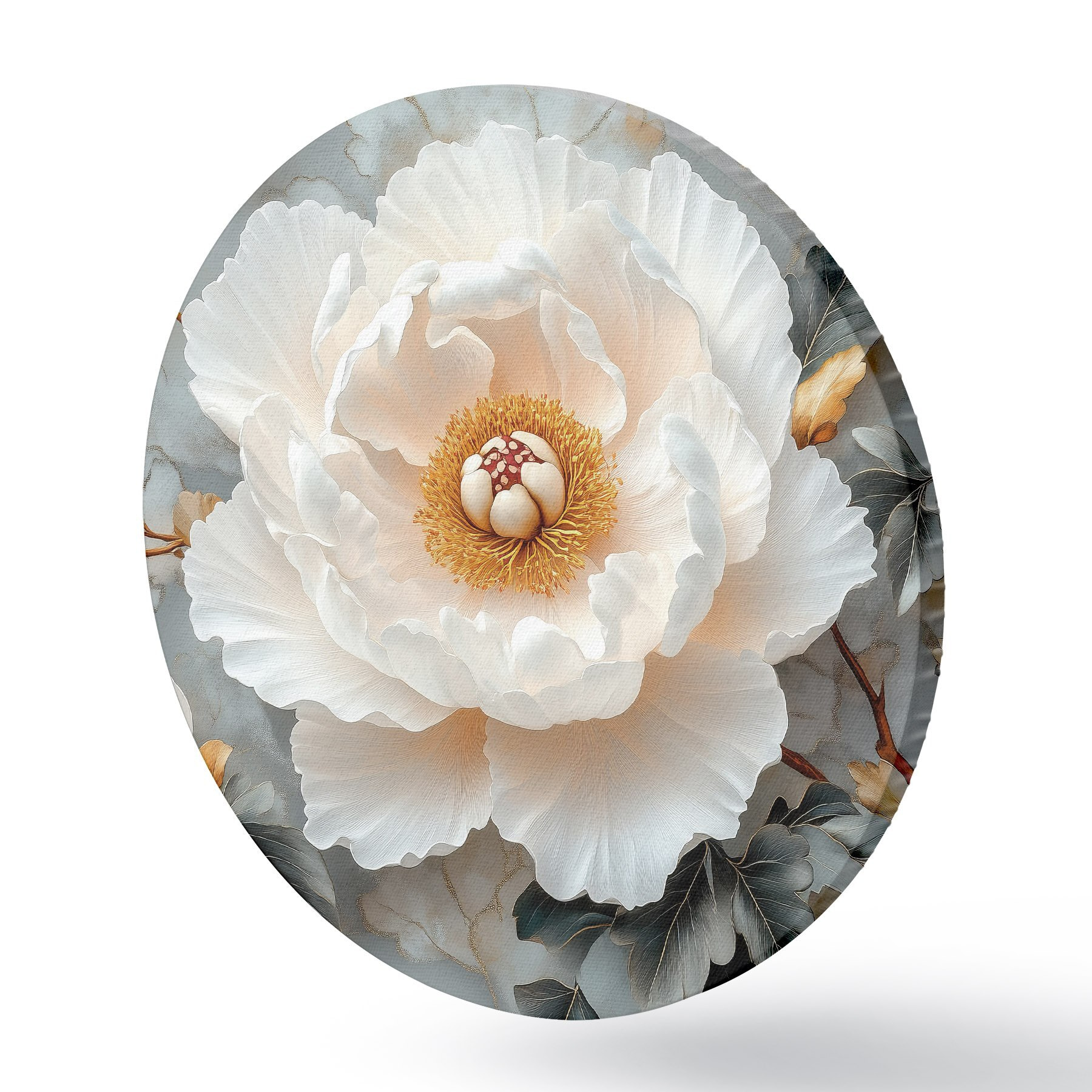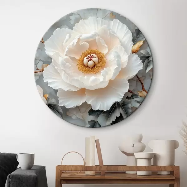 Quadri rotondi Una splendida peonia su uno sfondo di foglie e piccole peonie r43315