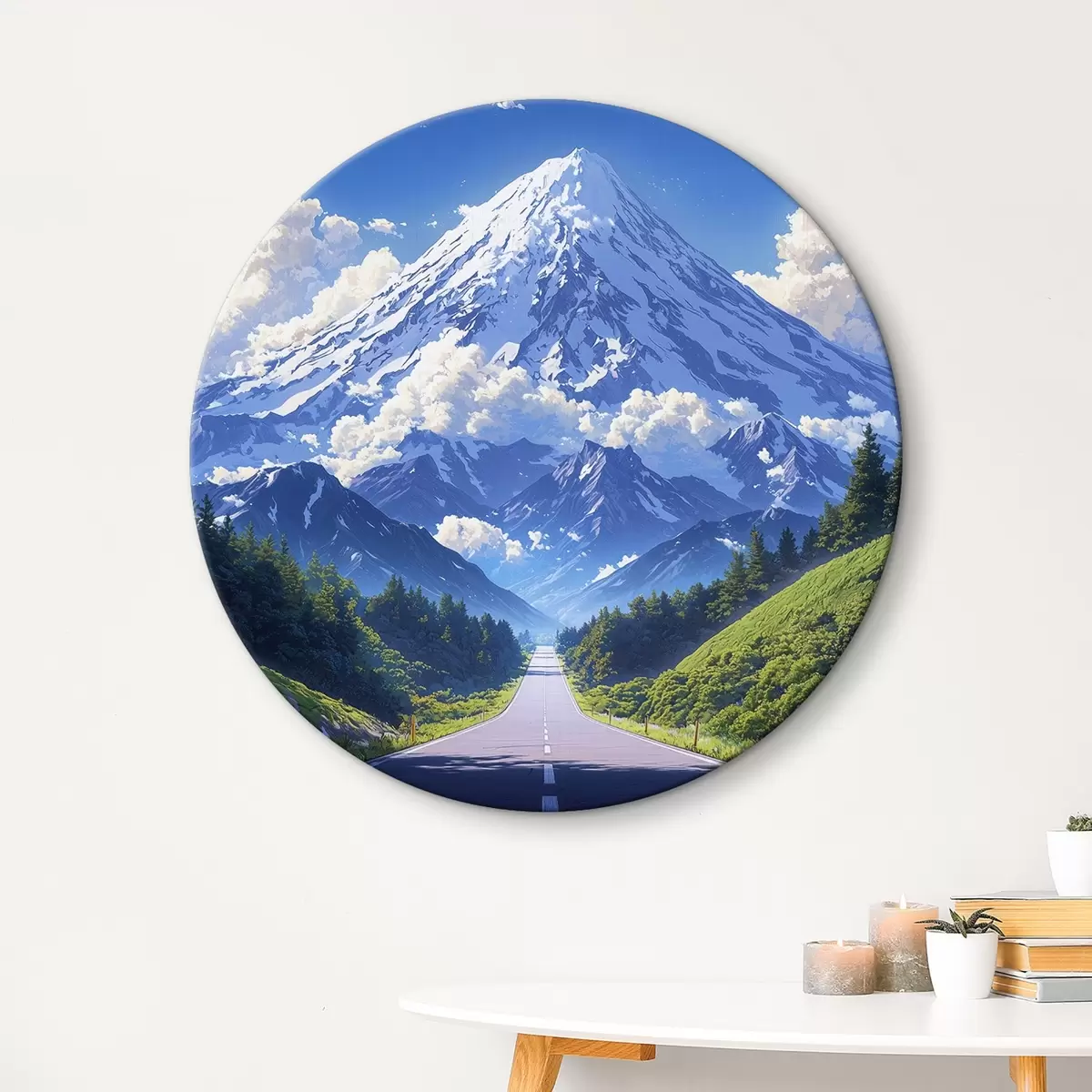 Quadri rotondi Strada verso le montagne con nuvole e boschi tutt'intorno r43317