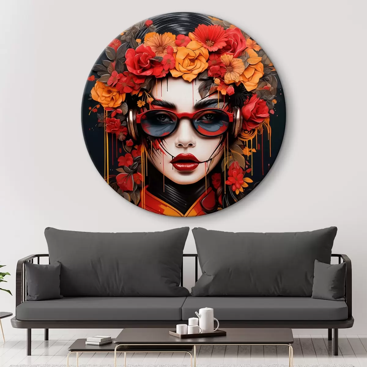 Quadri rotondi Donna con fiori in testa, stile street art r43362