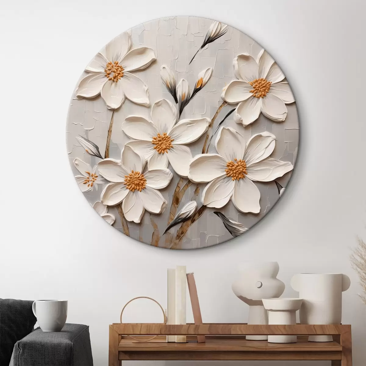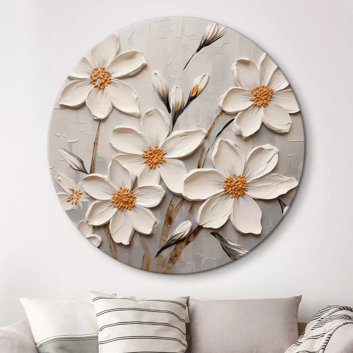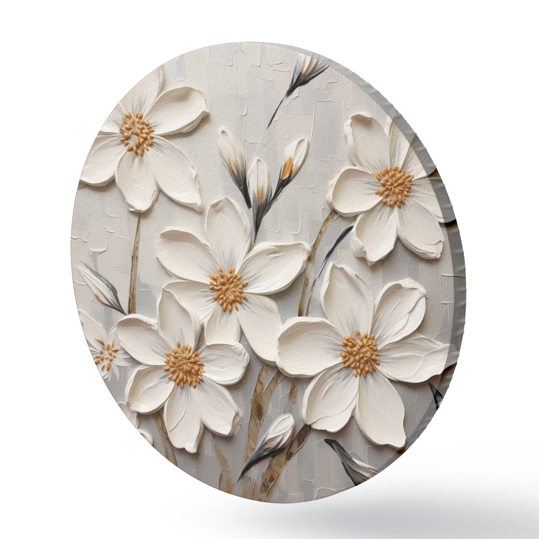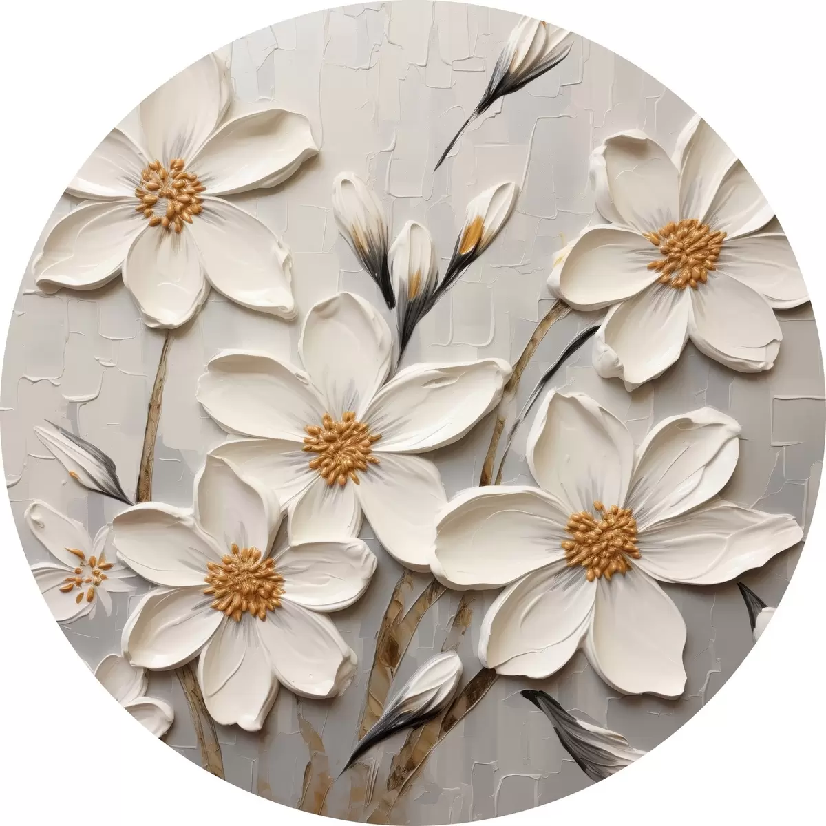 Quadri rotondi Fiori bianchi voluminosi in stile pittura con grandi pennellate r43366