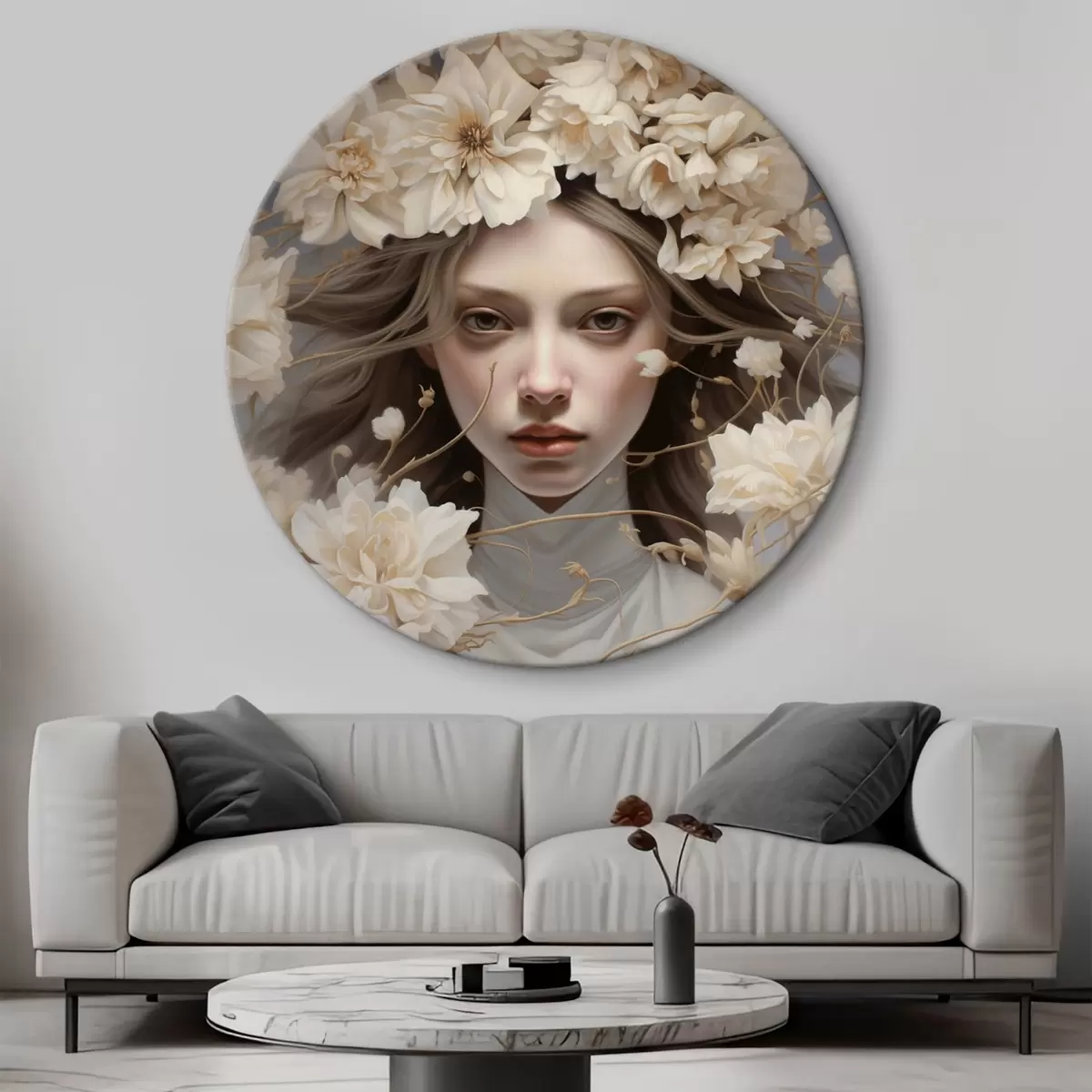 Quadri rotondi Ragazza tra i fiori in toni pacati r43367