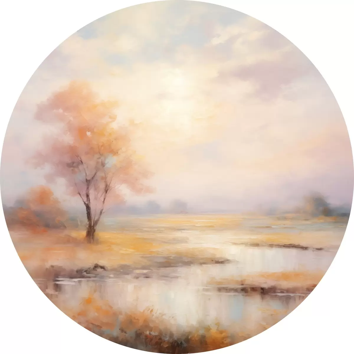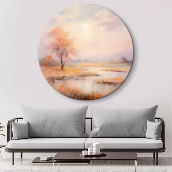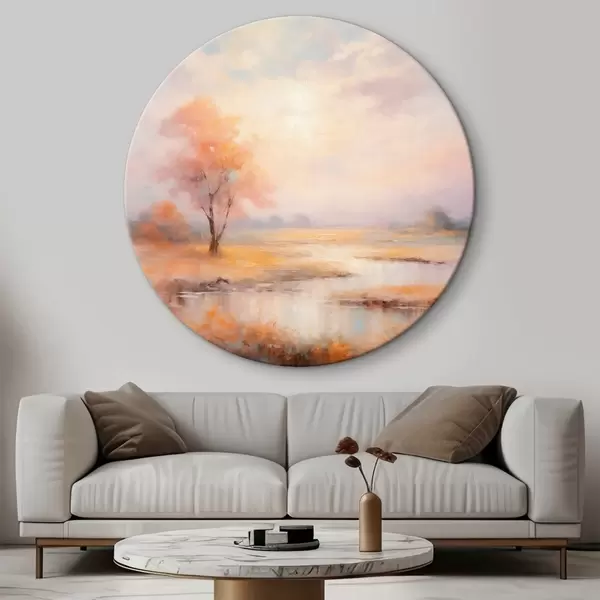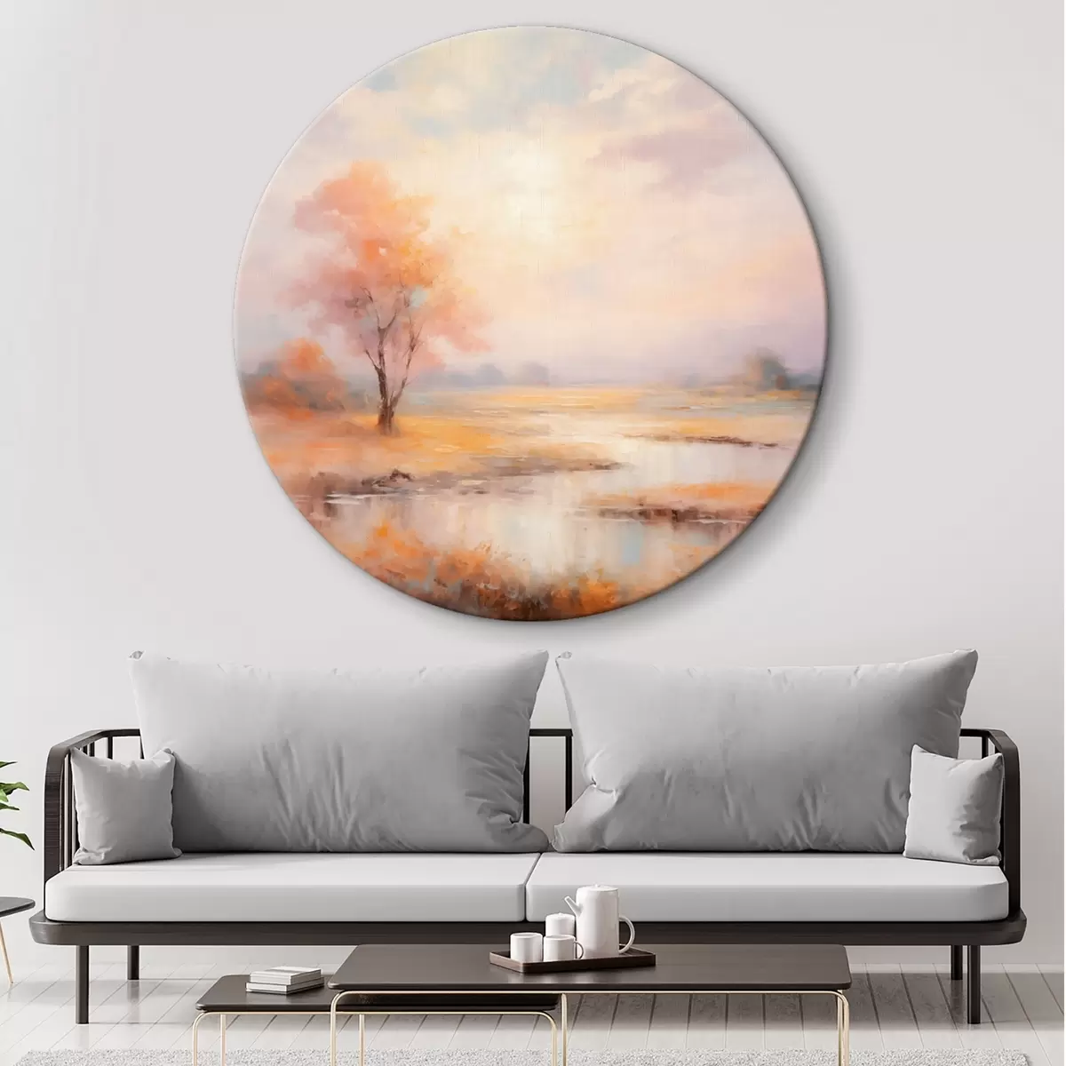 Quadri rotondi Paesaggio dai toni caldi con un fiume e un albero r43375