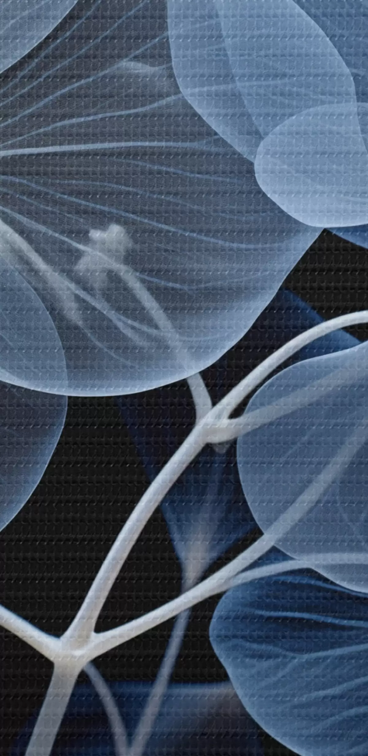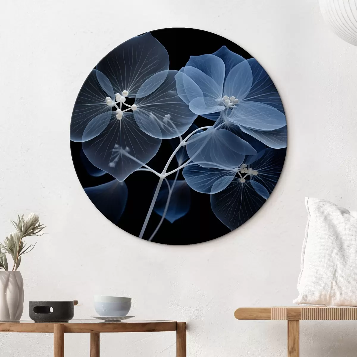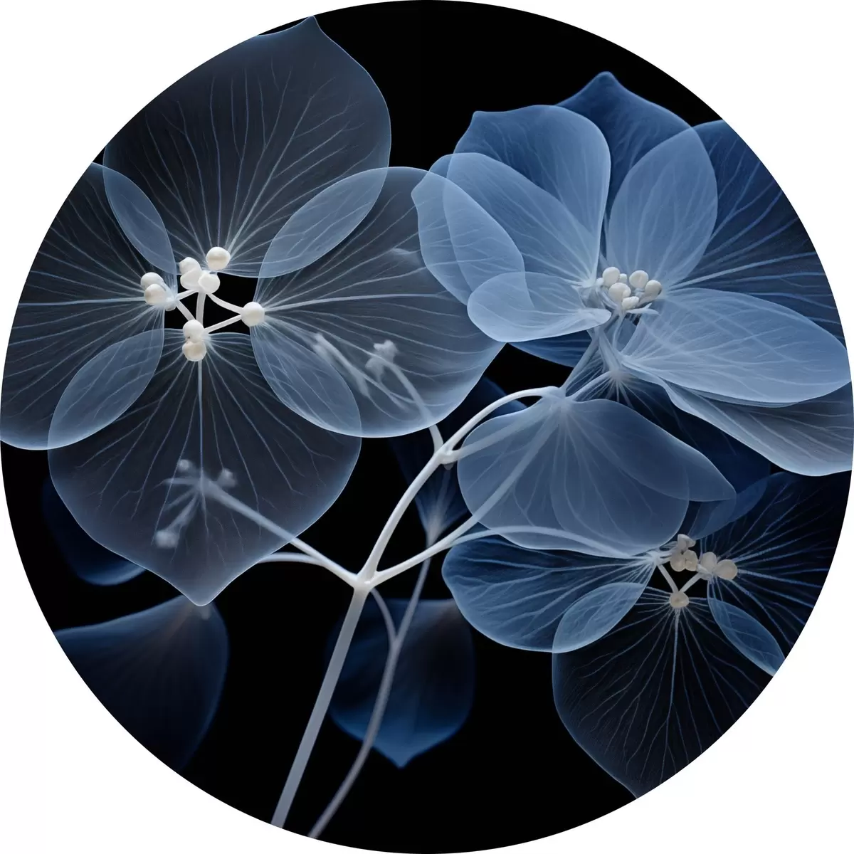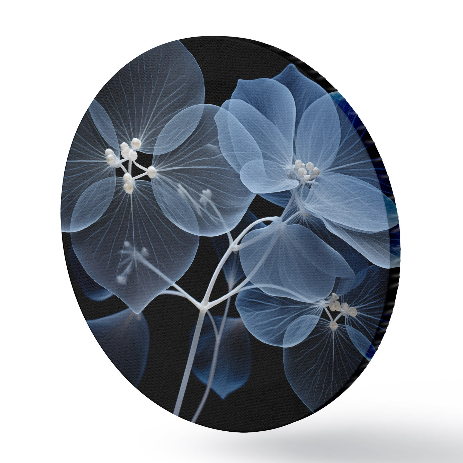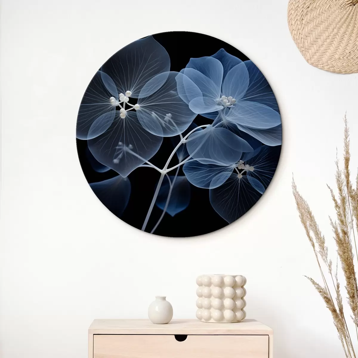 Quadri rotondi Un fiore di ortensia blu traslucido con stami blu e uno stelo delicato, su sfondo nero r43395