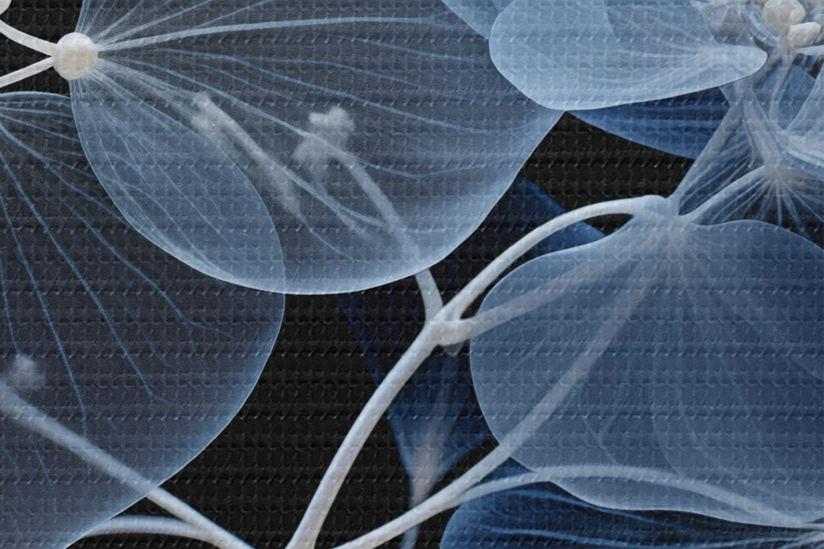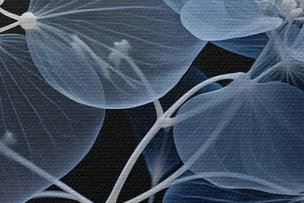 Immagine Un fiore di ortensia blu traslucido con stami blu e uno stelo delicato, su sfondo nero Nr r43395